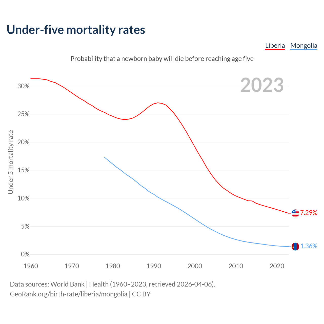 The chance that a newborn baby will die before reaching age five is 7.29% in Liberia and 1.36% in Mongolia. Above is a chart with historical data on under-five mortality rates.