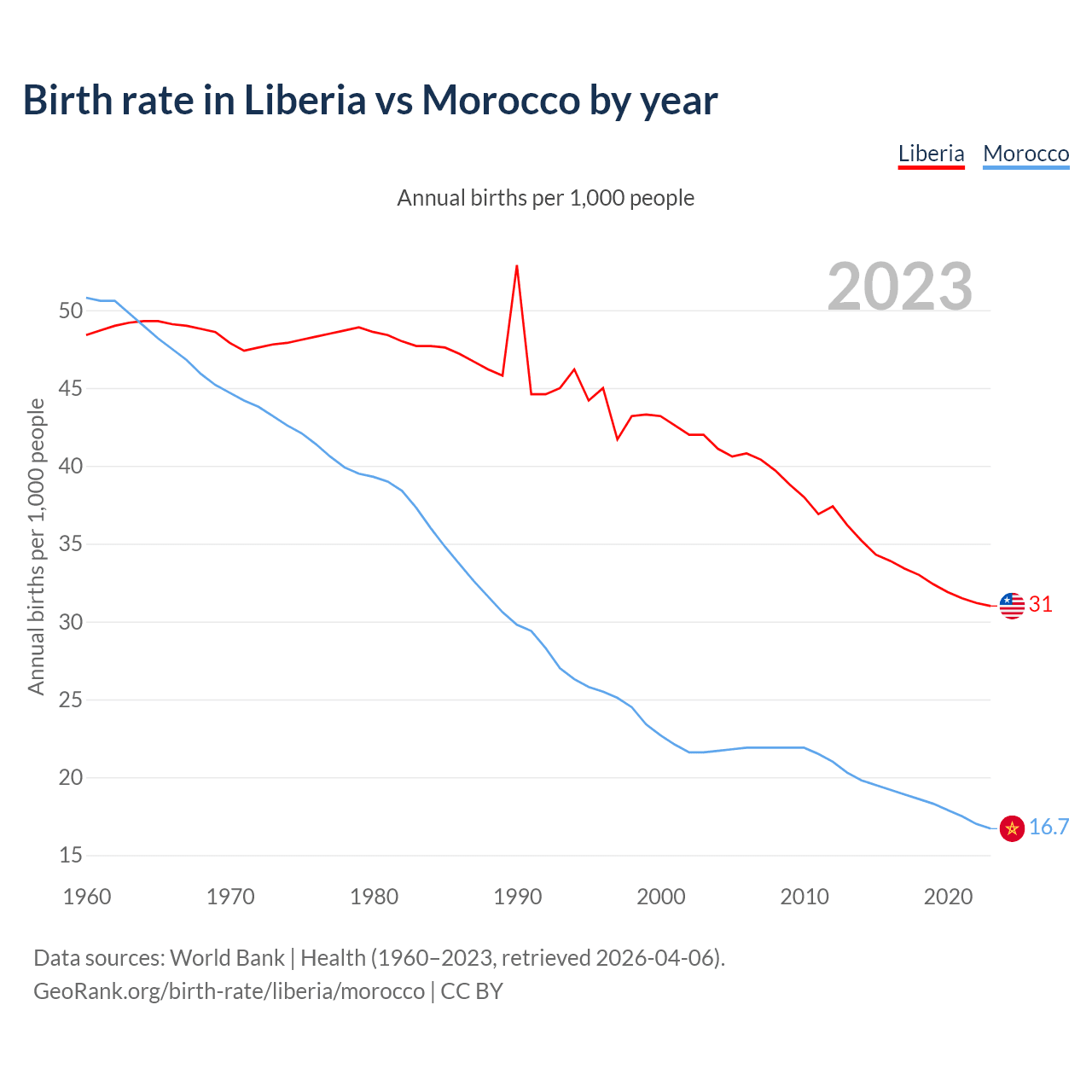 Liberia has an annual birth rate of 31 births per 1,000 people, compared to 16.7 for Morocco. The average number of children a woman is expected to have during her lifetime — the fertility rate, is 3.95 in Liberia and 2.23 in Morocco — 43.5% difference.