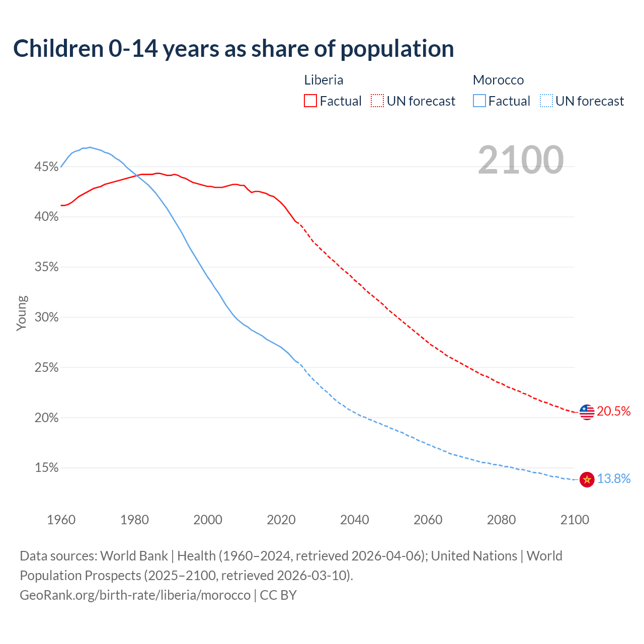 According to the latest available data on birth rates, the fertility rate in Liberia was 3.95 children per woman in 2023, compared to 2.23 in Morocco in 2023. The replacement level is considered to be 2.1 children per woman.