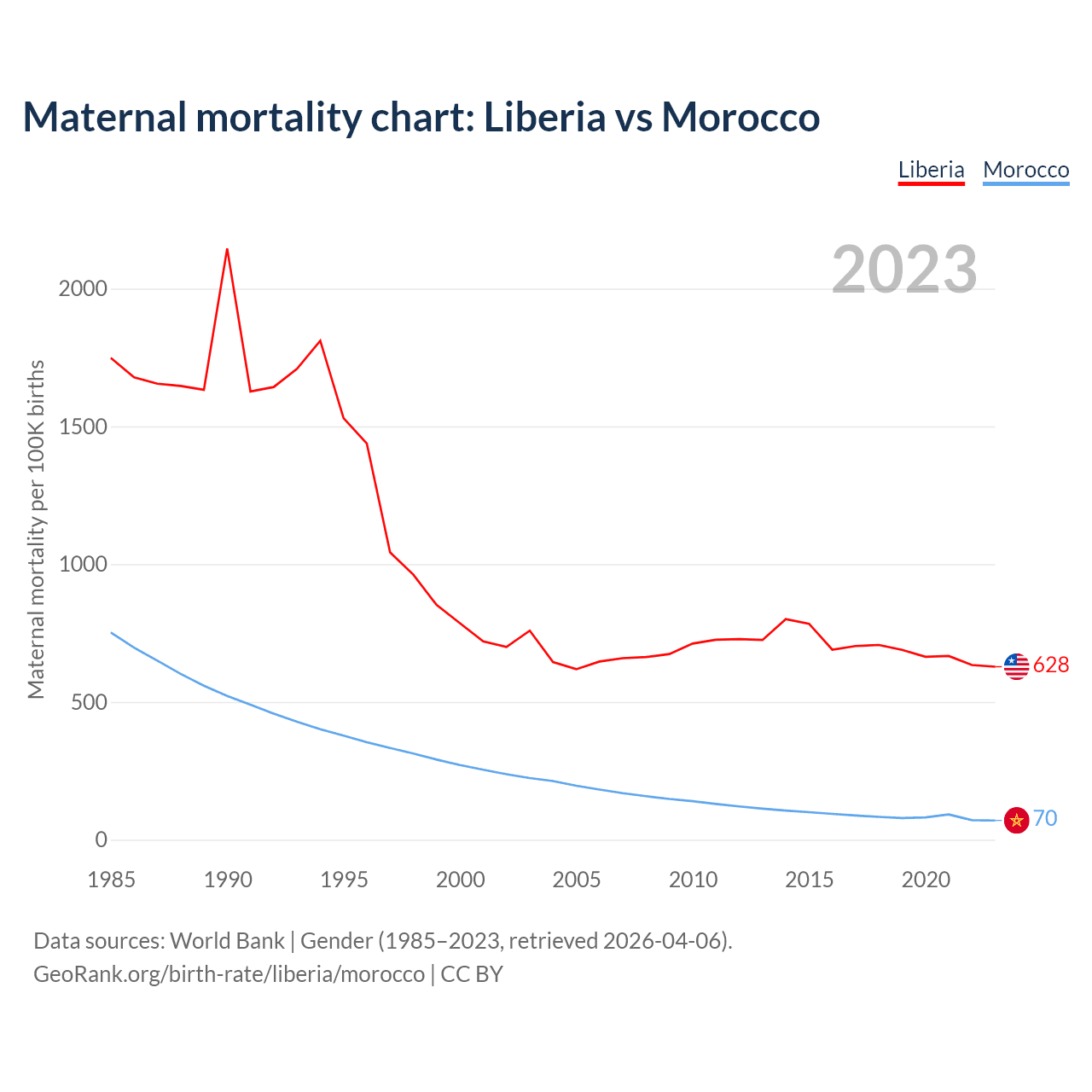 The maternal mortality rate, which is the probability of dying during childbirth or within 42 days of pregnancy termination, is 628 deaths per 100,000 live births in Liberia, compared to 70 deaths in Morocco.