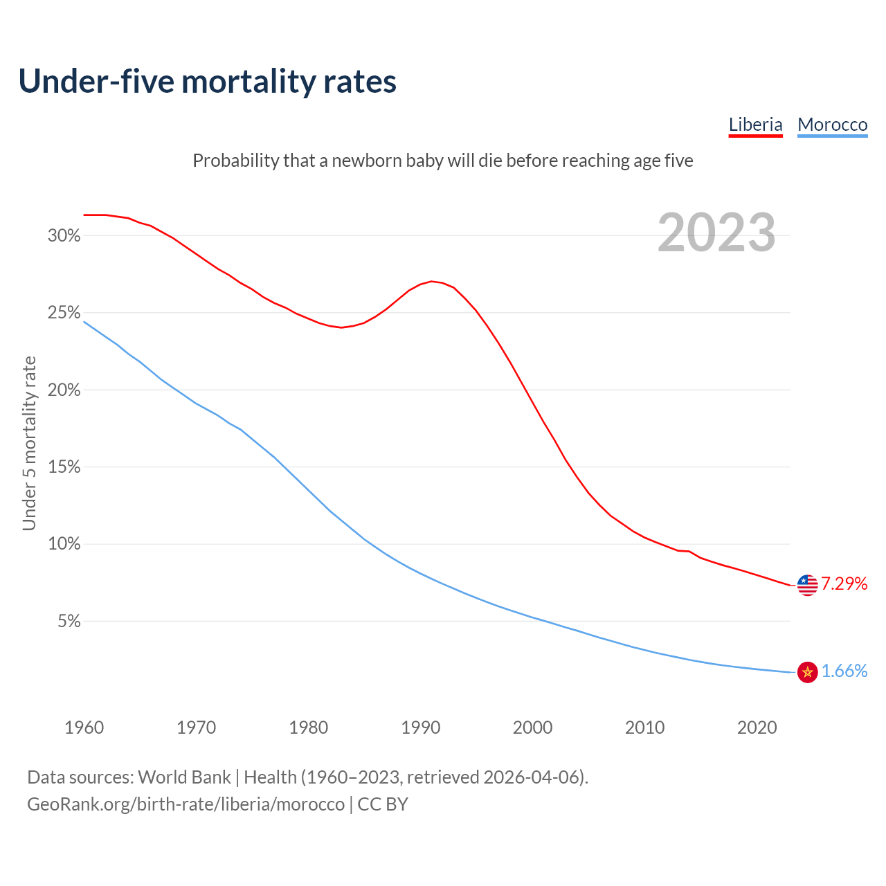 The chance that a newborn baby will die before reaching age five is 7.29% in Liberia and 1.66% in Morocco. Above is a chart with historical data on under-five mortality rates.