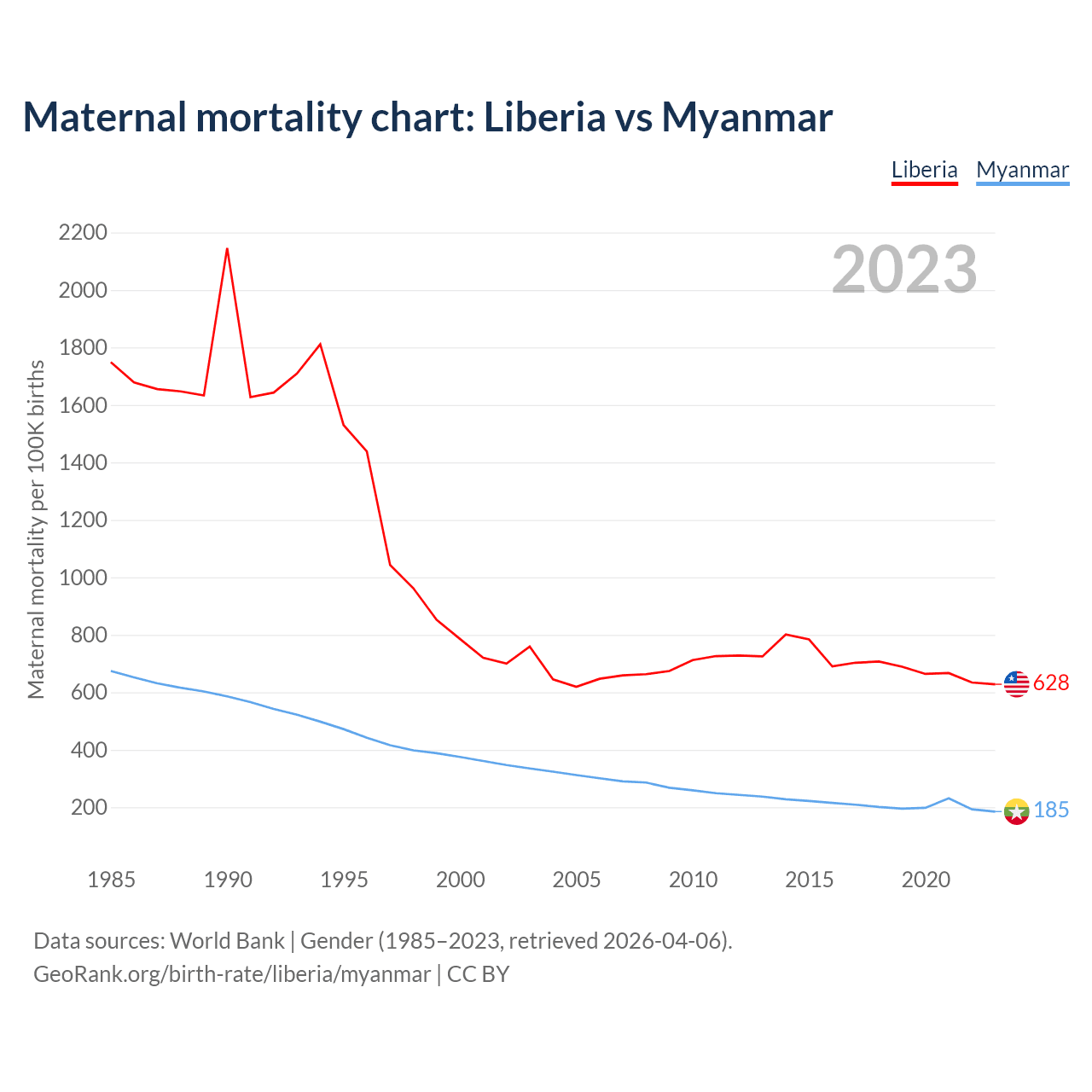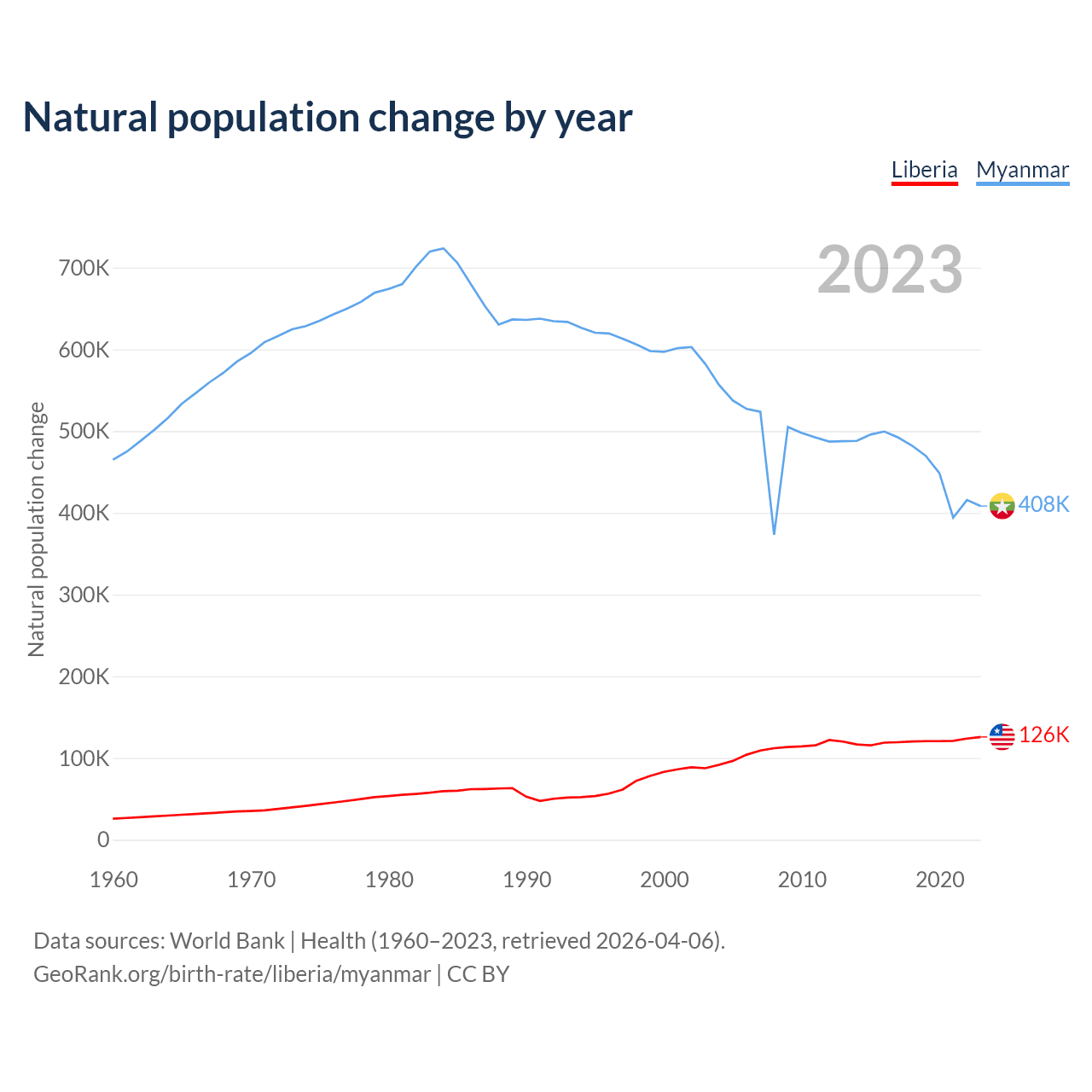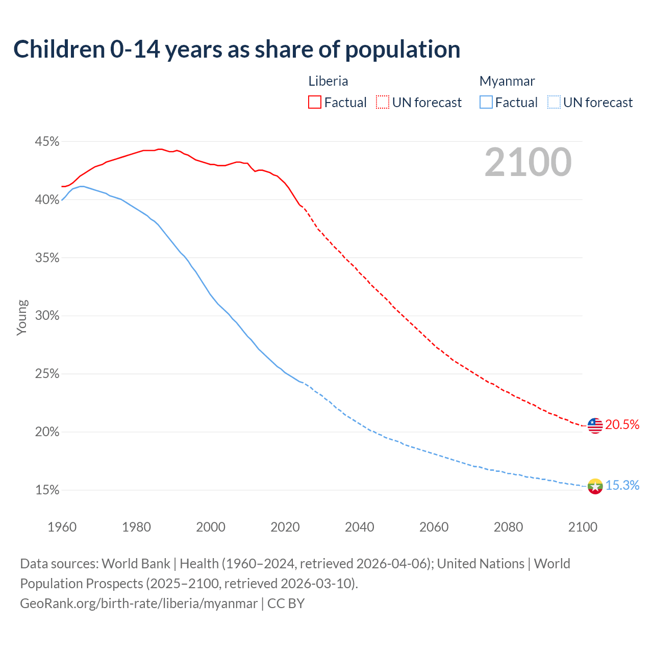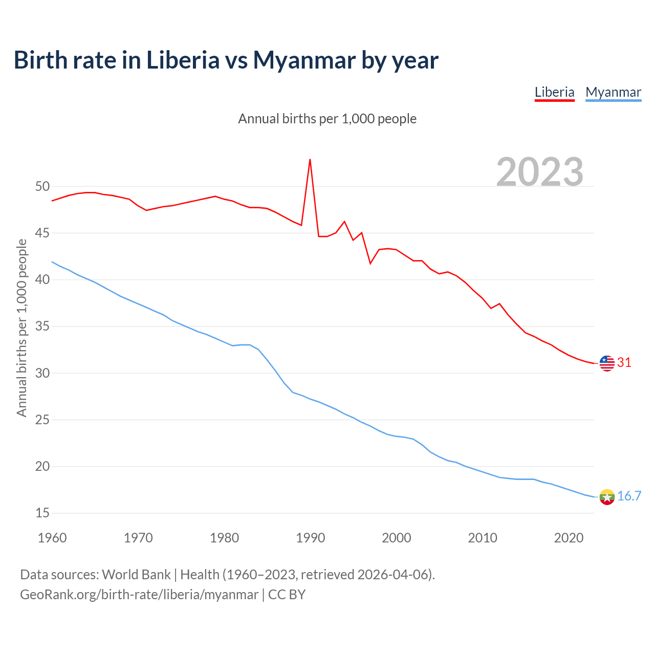 According to the latest available data on birth rates, the fertility rate in Liberia was 3.95 children per woman in 2023, compared to 2.12 in Myanmar in 2023. The replacement level is considered to be 2.1 children per woman.