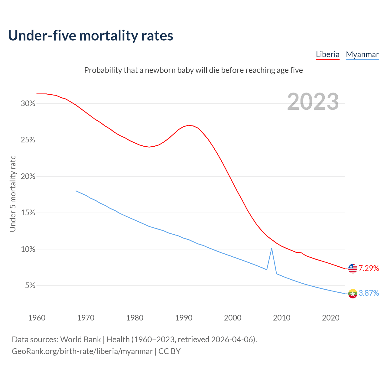 The chance that a newborn baby will die before reaching age five is 7.29% in Liberia and 3.87% in Myanmar. Above is a chart with historical data on under-five mortality rates.