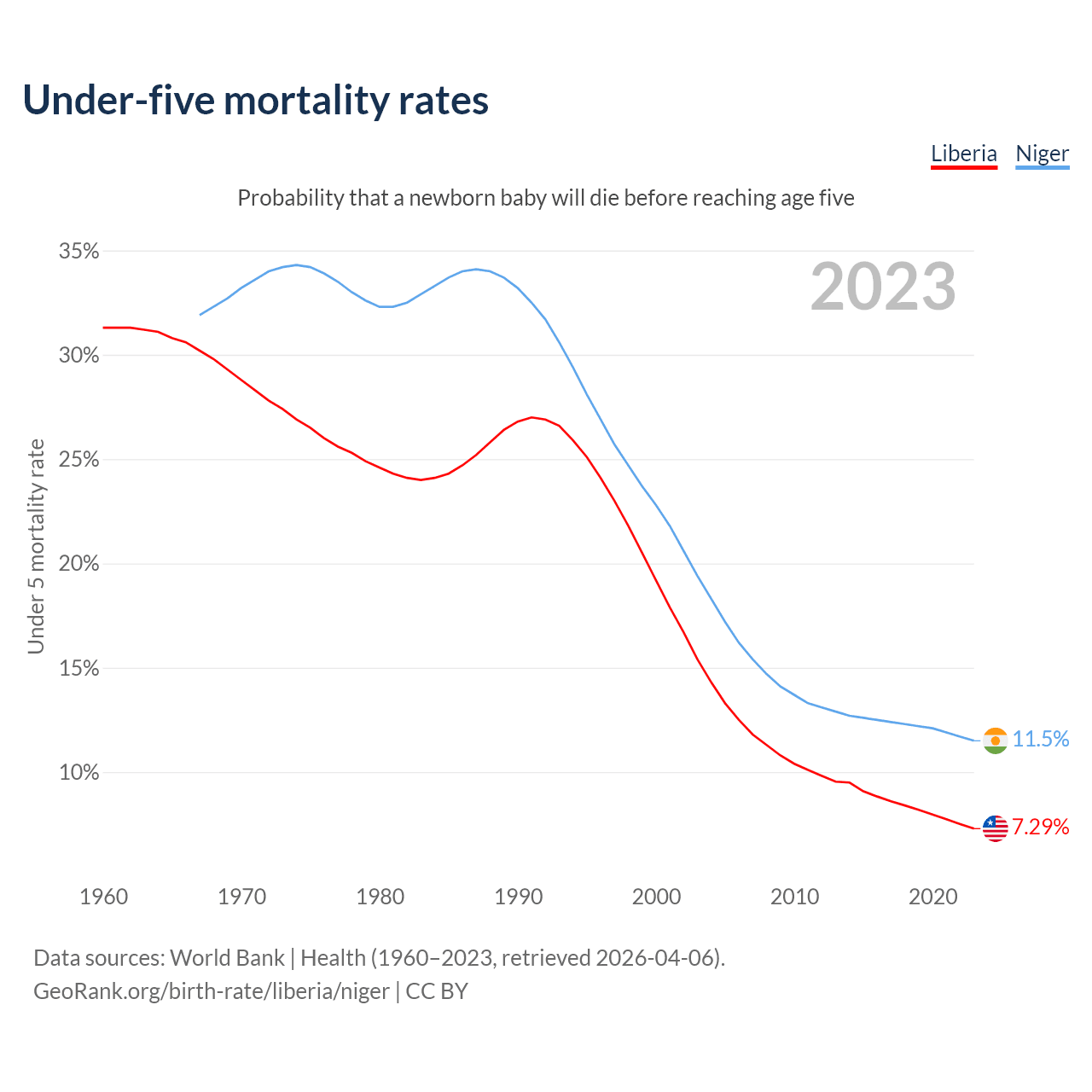 The chance that a newborn baby will die before reaching age five is 7.29% in Liberia and 11.5% in Niger. Above is a chart with historical data on under-five mortality rates.