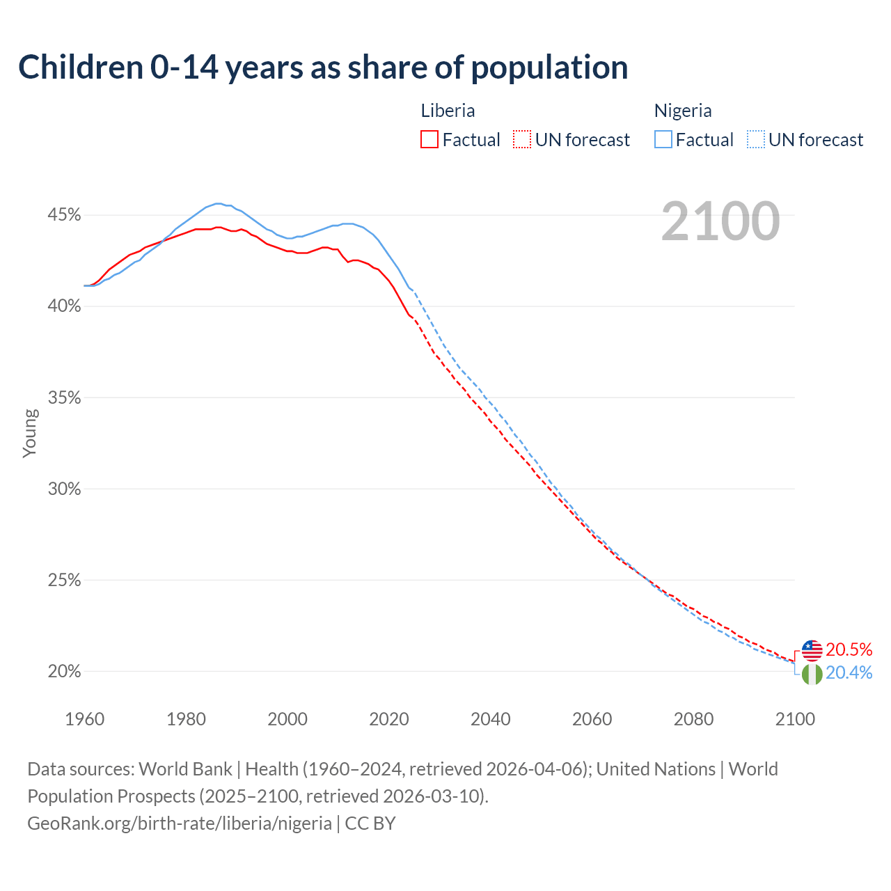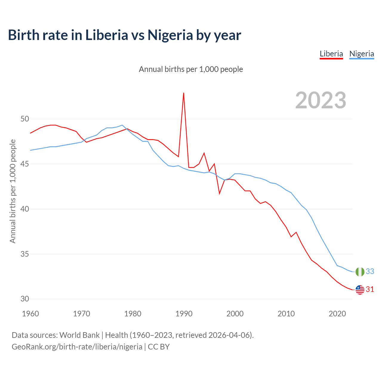 According to the latest available data on birth rates, the fertility rate in Liberia was 3.95 children per woman in 2023, compared to 4.48 in Nigeria in 2023. The replacement level is considered to be 2.1 children per woman.