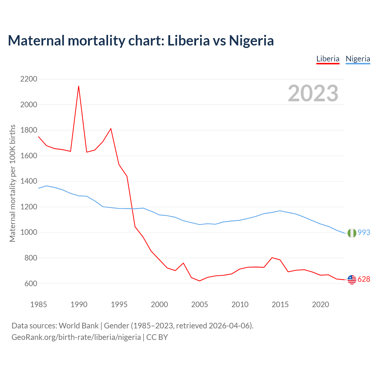 The maternal mortality rate, which is the probability of dying during childbirth or within 42 days of pregnancy termination, is 628 deaths per 100,000 live births in Liberia, compared to 993 deaths in Nigeria.