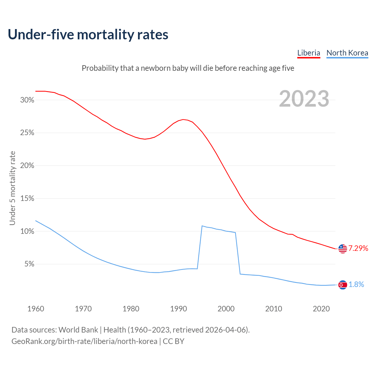 The chance that a newborn baby will die before reaching age five is 7.29% in Liberia and 1.8% in North Korea. Above is a chart with historical data on under-five mortality rates.