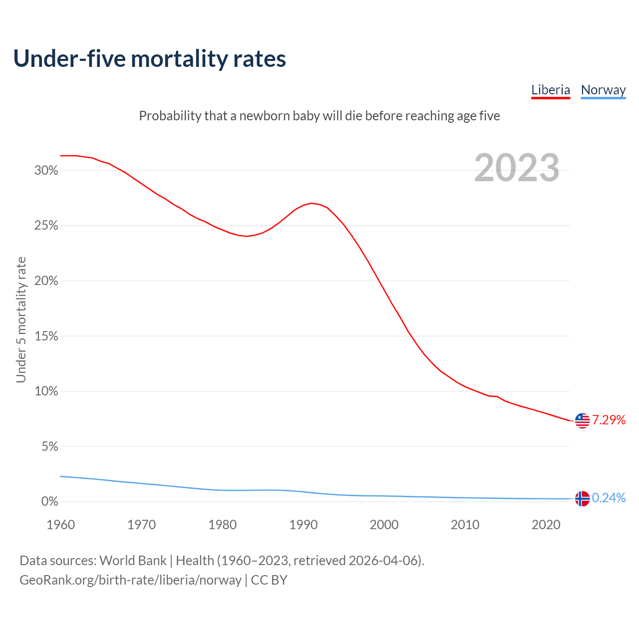 The chance that a newborn baby will die before reaching age five is 7.29% in Liberia and 0.24% in Norway. Above is a chart with historical data on under-five mortality rates.