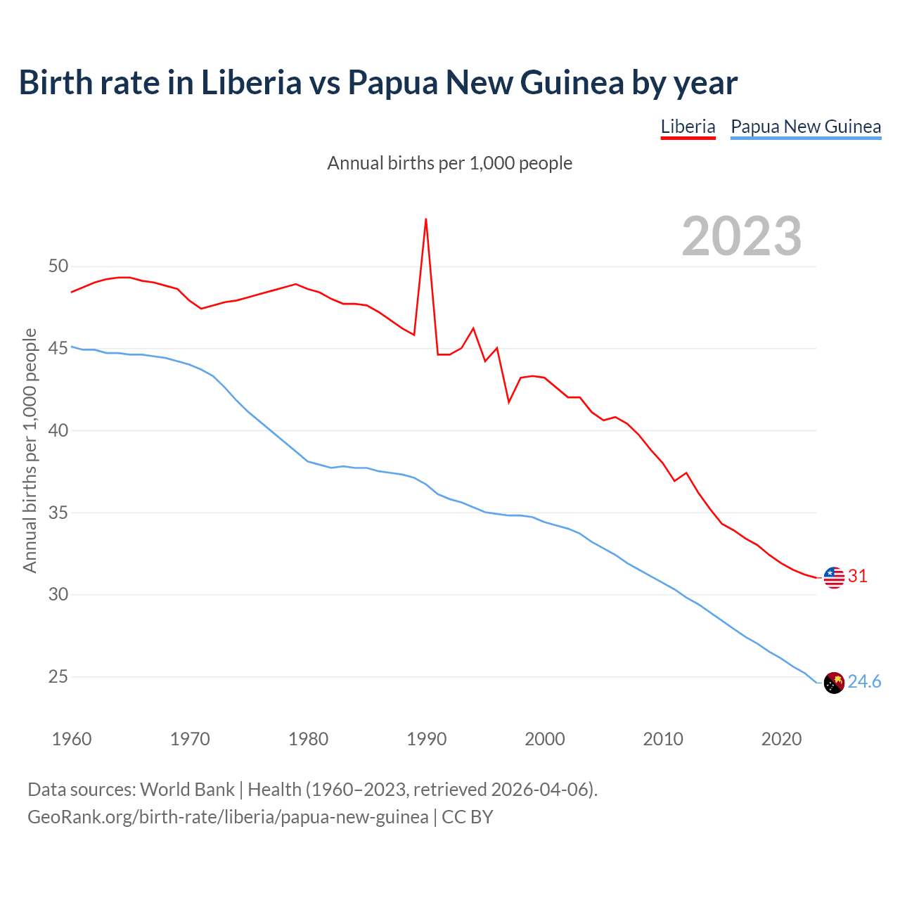Liberia has an annual birth rate of 31 births per 1,000 people, compared to 24.6 for Papua New Guinea. The average number of children a woman is expected to have during her lifetime — the fertility rate, is 3.95 in Liberia and 3.1 in Papua New Guinea — 21.5% difference.