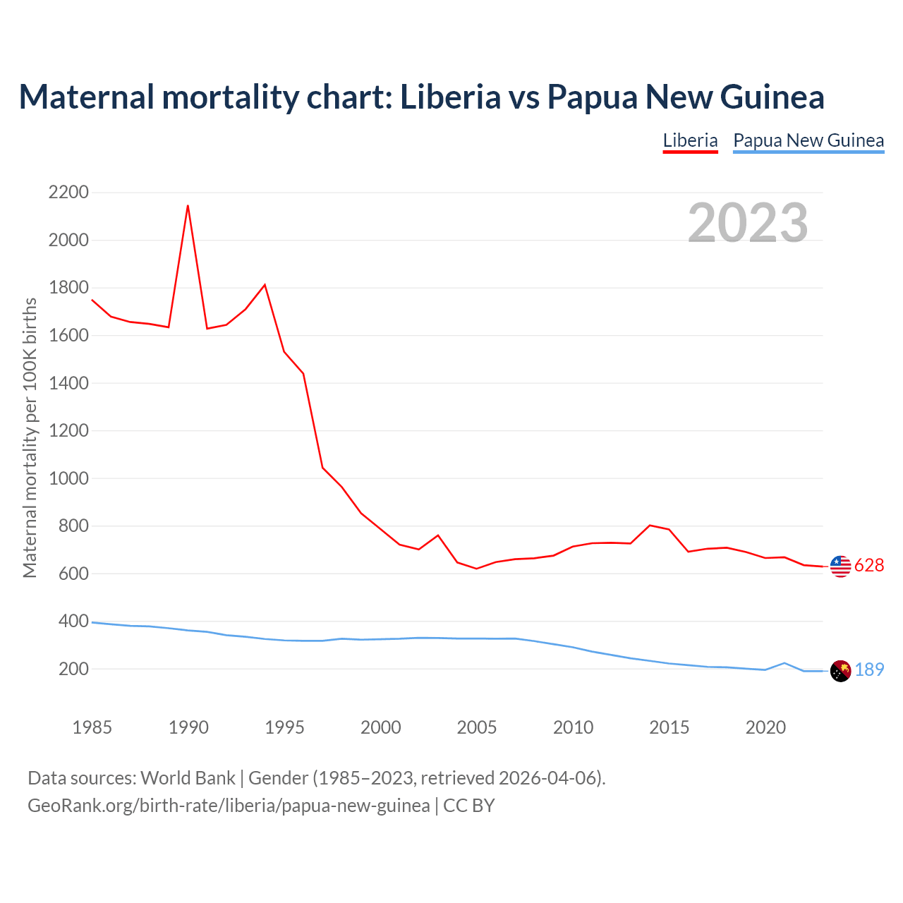 The maternal mortality rate, which is the probability of dying during childbirth or within 42 days of pregnancy termination, is 628 deaths per 100,000 live births in Liberia, compared to 189 deaths in Papua New Guinea.