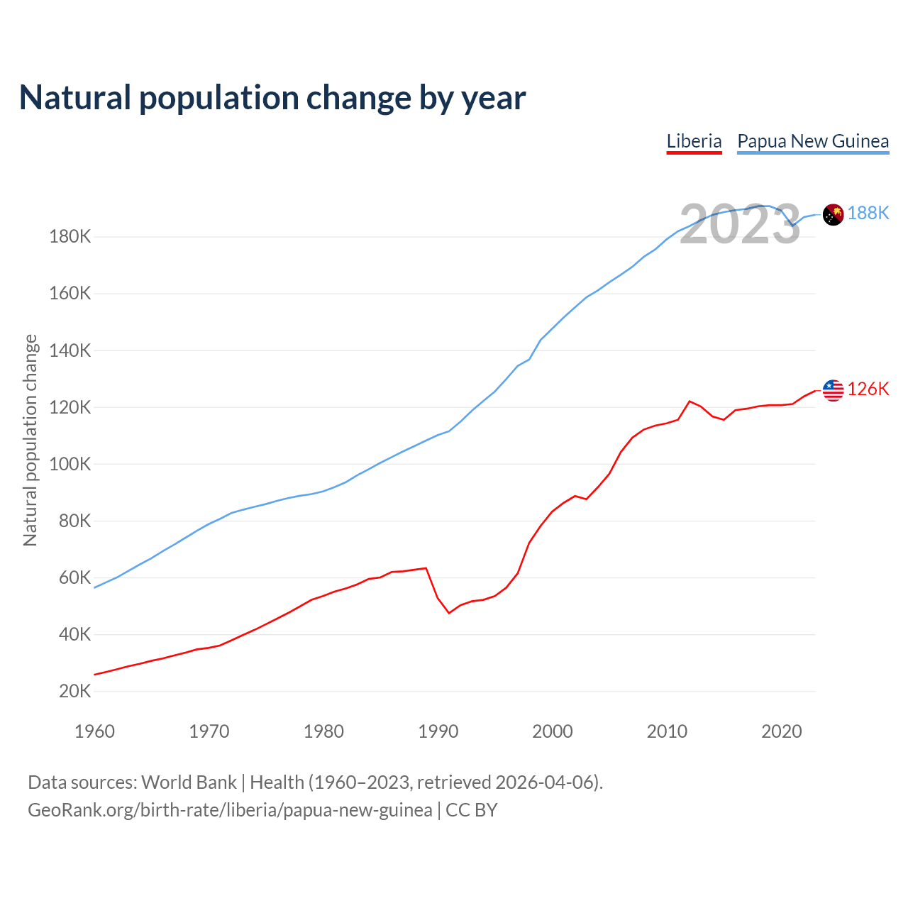 According to the latest available data on birth rates, the fertility rate in Liberia was 3.95 children per woman in 2023, compared to 3.1 in Papua New Guinea in 2023. The replacement level is considered to be 2.1 children per woman.