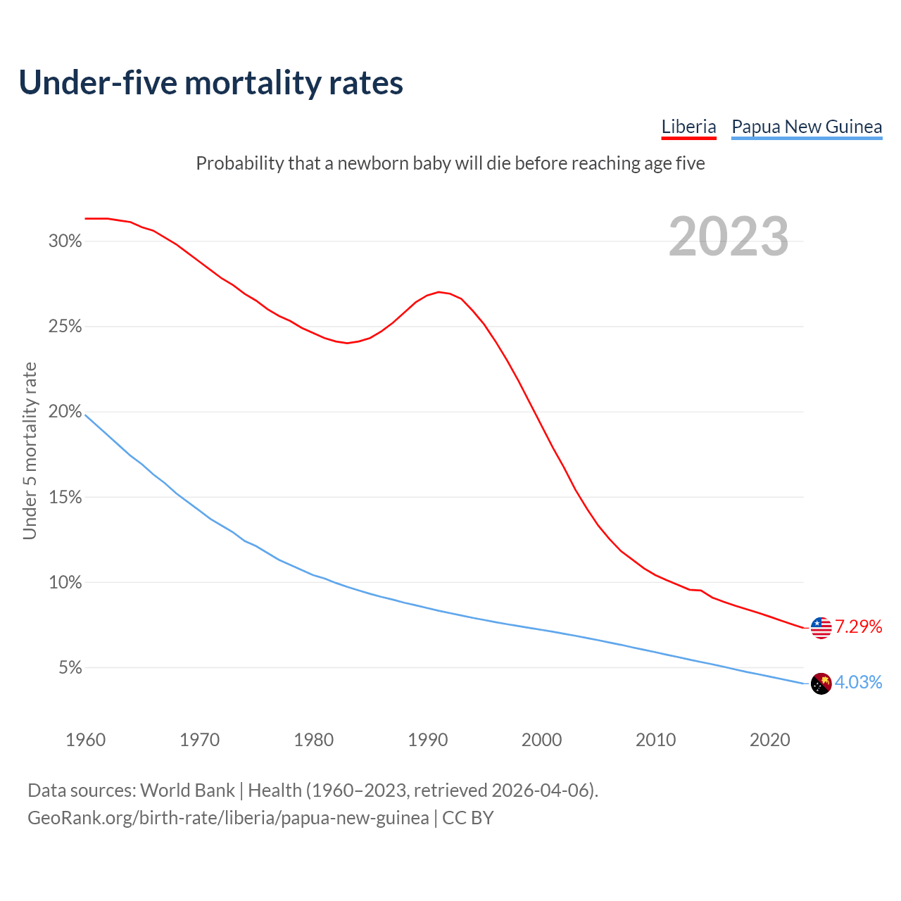 The chance that a newborn baby will die before reaching age five is 7.29% in Liberia and 4.03% in Papua New Guinea. Above is a chart with historical data on under-five mortality rates.