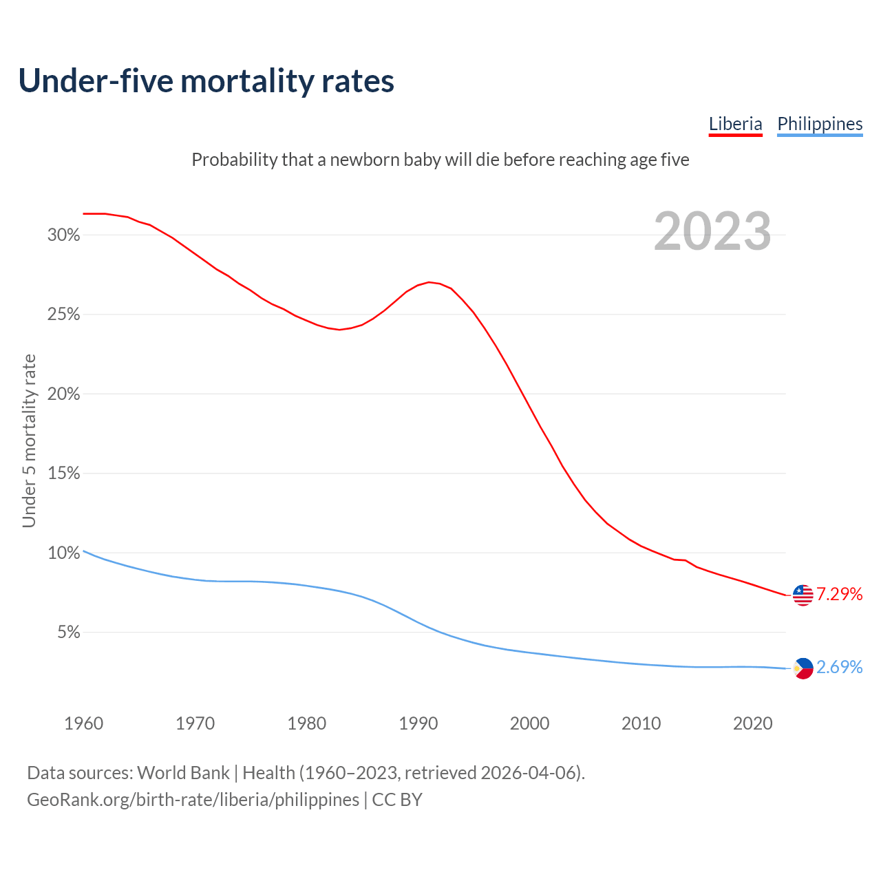 The chance that a newborn baby will die before reaching age five is 7.29% in Liberia and 2.69% in the Philippines. Above is a chart with historical data on under-five mortality rates.