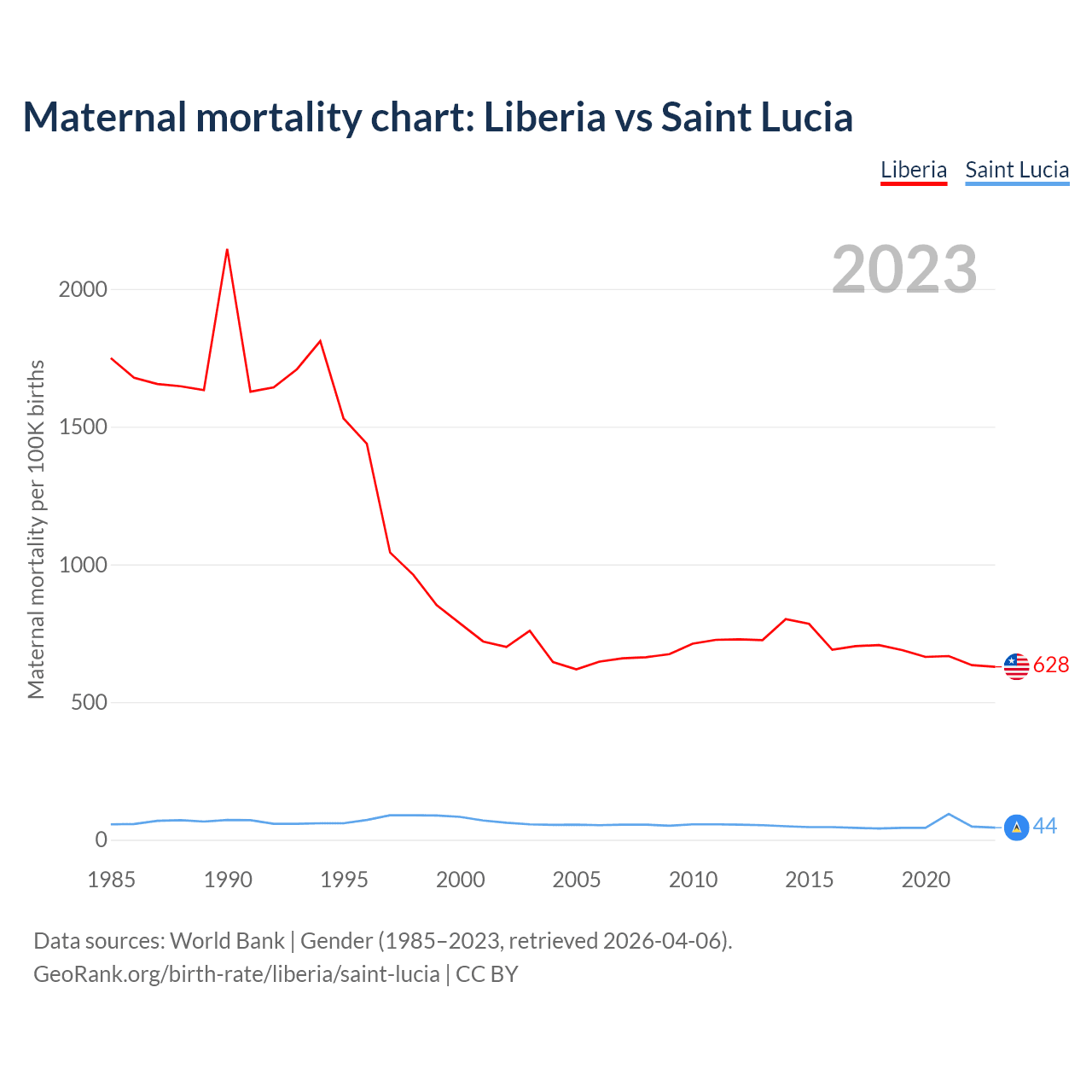 The maternal mortality rate, which is the probability of dying during childbirth or within 42 days of pregnancy termination, is 628 deaths per 100,000 live births in Liberia, compared to 44 deaths in Saint Lucia.