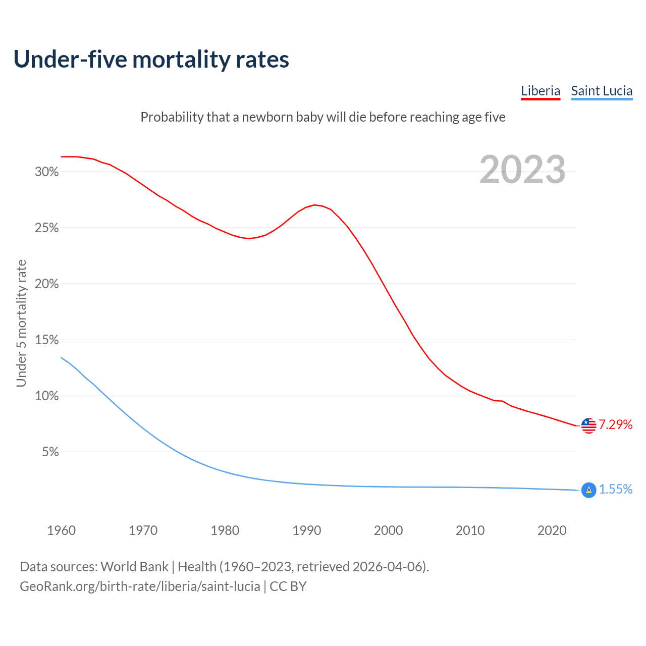 The chance that a newborn baby will die before reaching age five is 7.29% in Liberia and 1.55% in Saint Lucia. Above is a chart with historical data on under-five mortality rates.