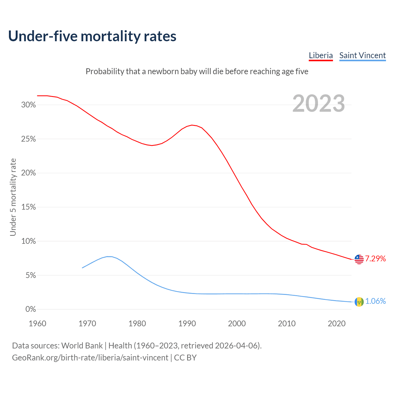 The chance that a newborn baby will die before reaching age five is 7.29% in Liberia and 1.06% in Saint Vincent. Above is a chart with historical data on under-five mortality rates.