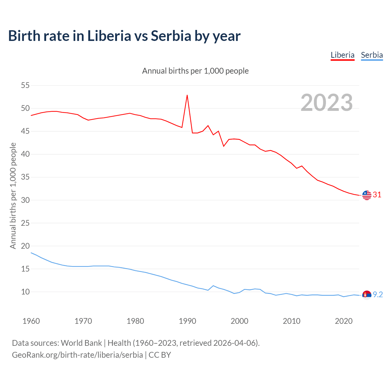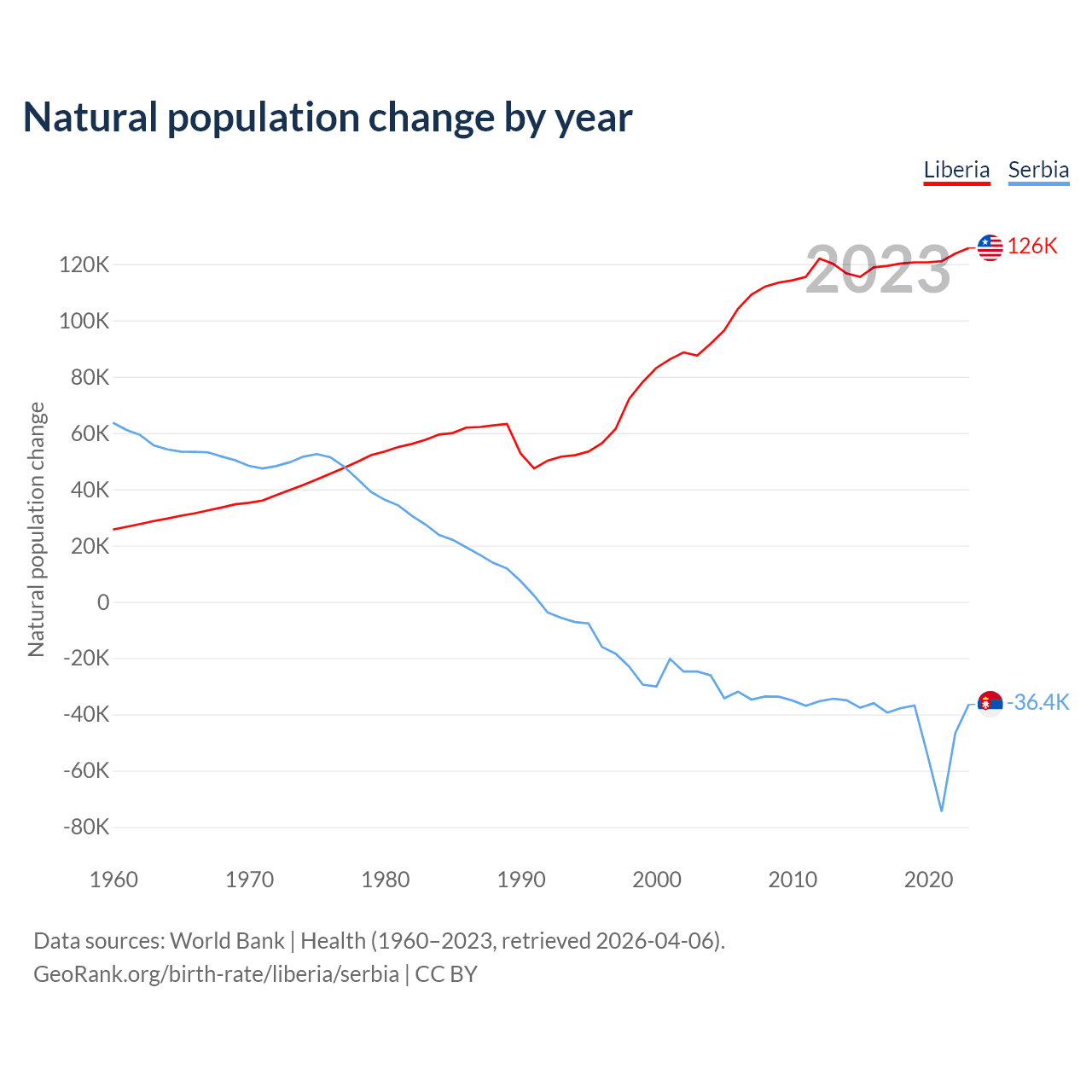 According to the latest available data on birth rates, the fertility rate in Liberia was 3.95 children per woman in 2023, compared to 1.61 in Serbia in 2023. The replacement level is considered to be 2.1 children per woman.