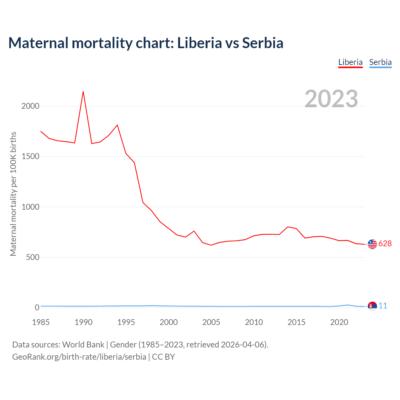 The maternal mortality rate, which is the probability of dying during childbirth or within 42 days of pregnancy termination, is 628 deaths per 100,000 live births in Liberia, compared to 11 deaths in Serbia.