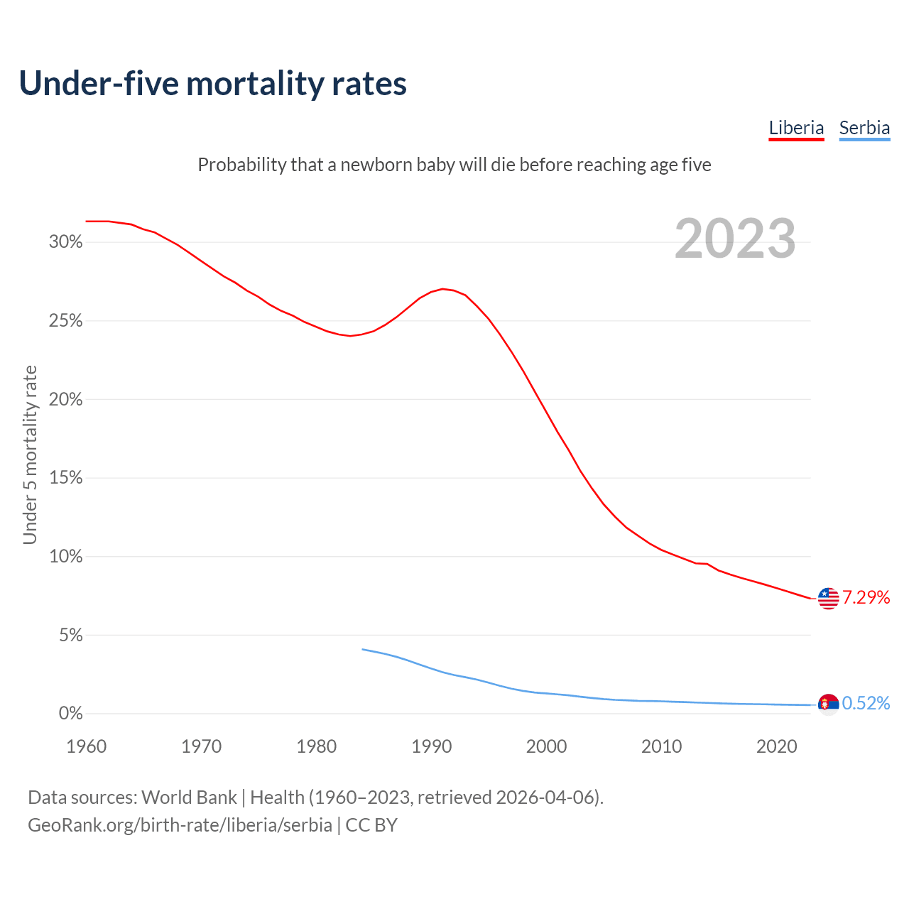 The chance that a newborn baby will die before reaching age five is 7.29% in Liberia and 0.52% in Serbia. Above is a chart with historical data on under-five mortality rates.