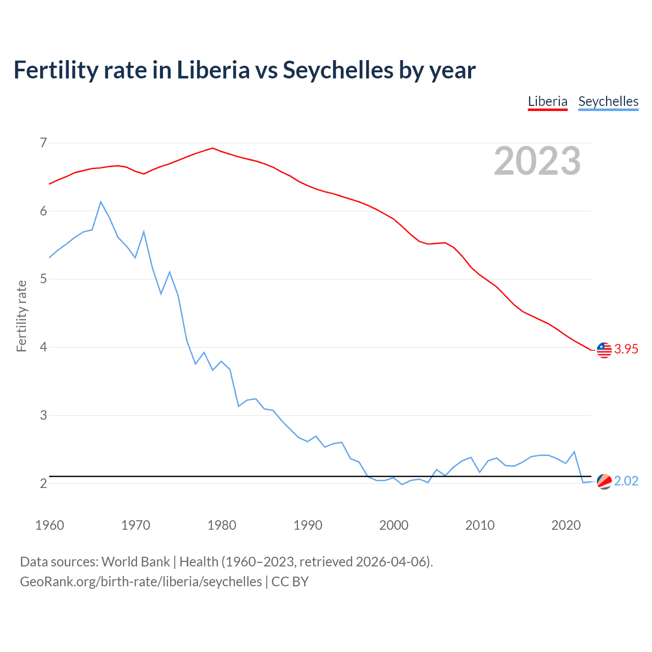 According to the latest available data on birth rates, the fertility rate in Liberia was 3.95 children per woman in 2023, compared to 2.02 in the Seychelles in 2023. The replacement level is considered to be 2.1 children per woman.