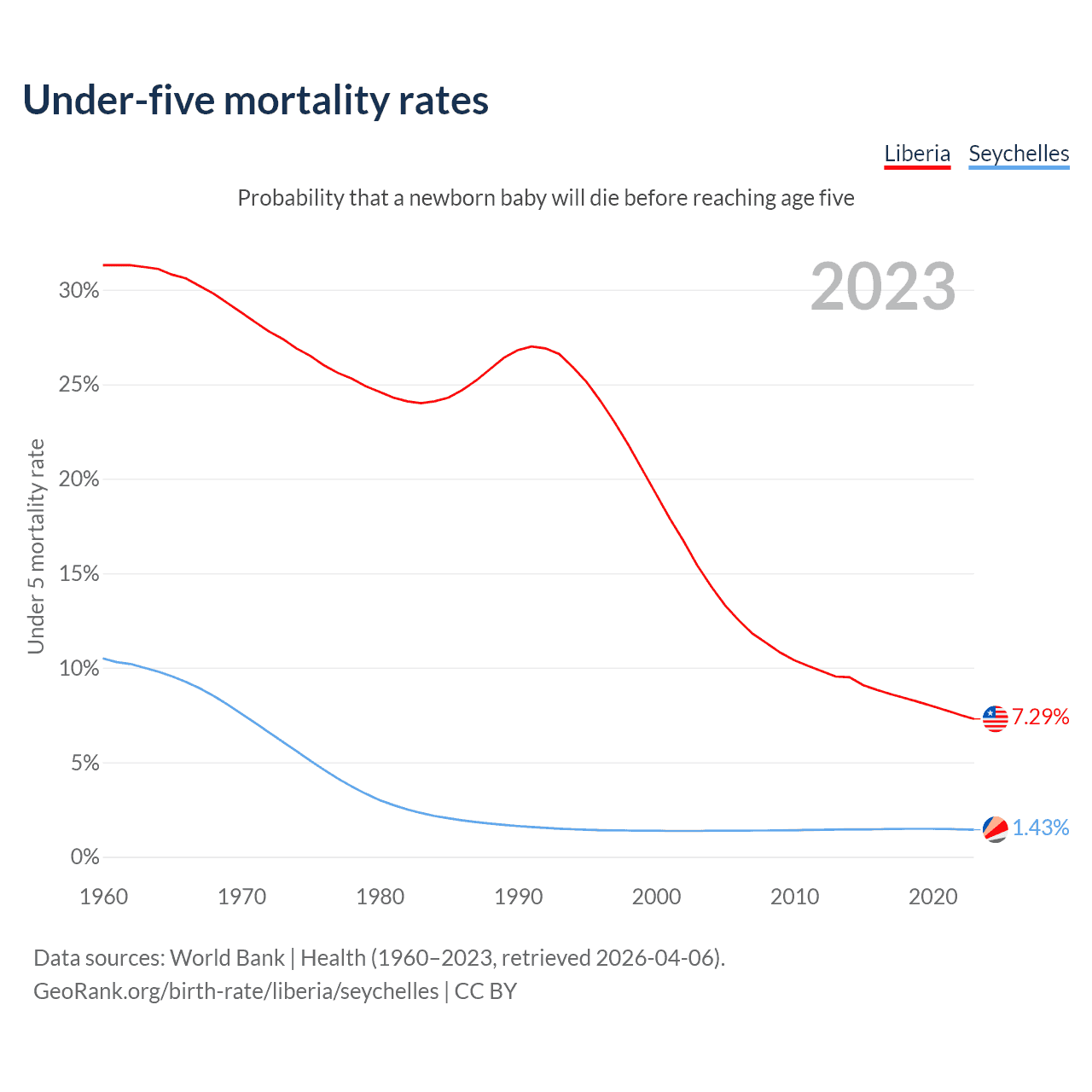The chance that a newborn baby will die before reaching age five is 7.29% in Liberia and 1.43% in the Seychelles. Above is a chart with historical data on under-five mortality rates.