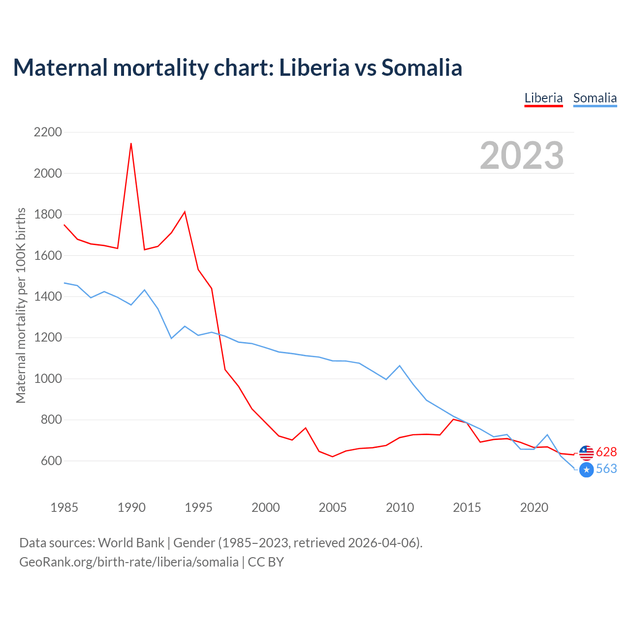 The maternal mortality rate, which is the probability of dying during childbirth or within 42 days of pregnancy termination, is 628 deaths per 100,000 live births in Liberia, compared to 563 deaths in Somalia.