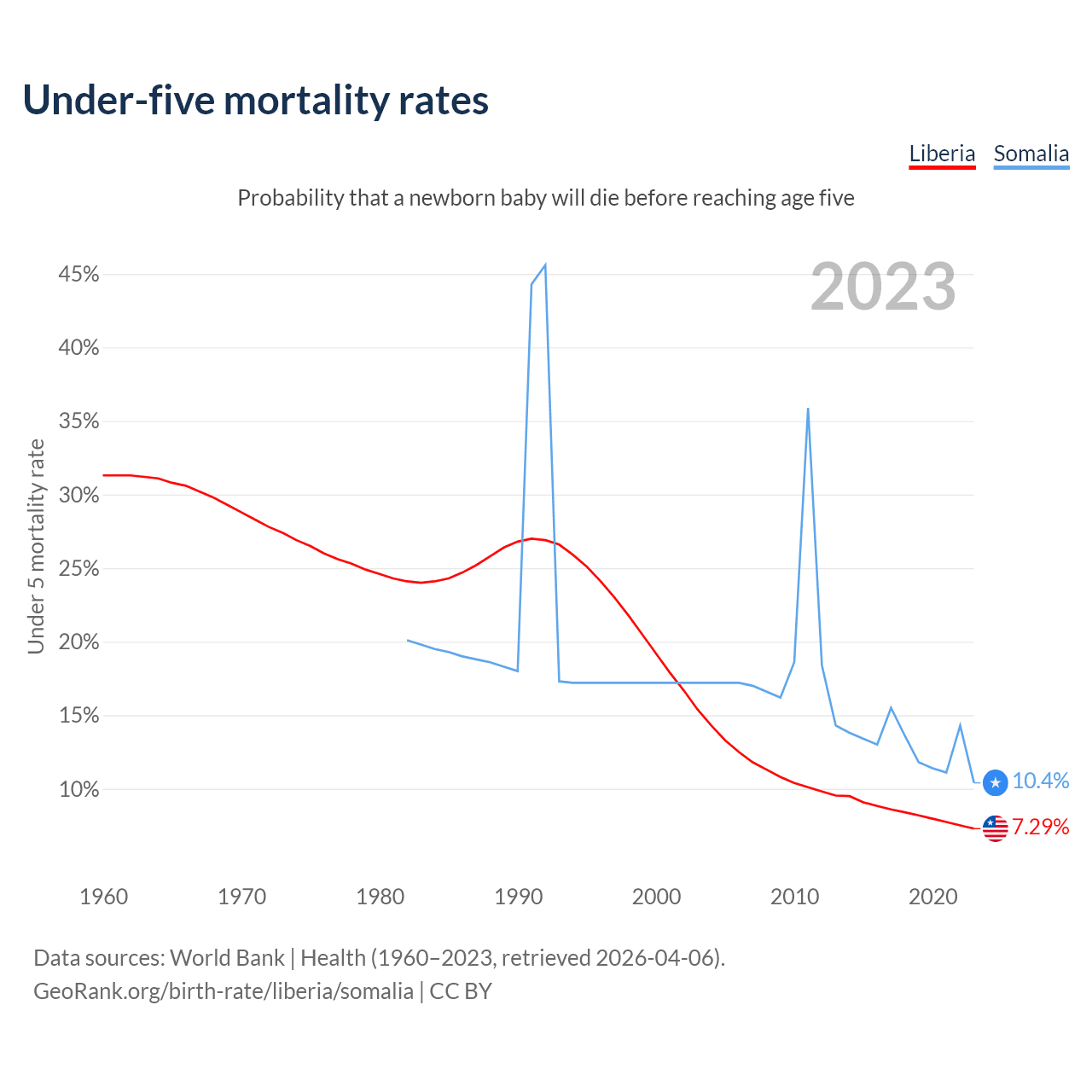 The chance that a newborn baby will die before reaching age five is 7.29% in Liberia and 10.4% in Somalia. Above is a chart with historical data on under-five mortality rates.