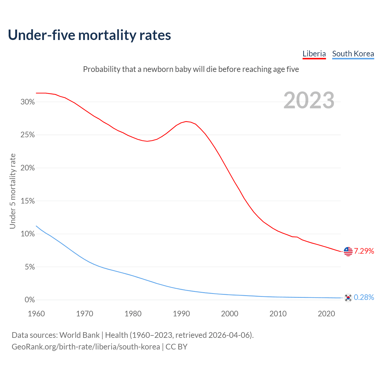 The chance that a newborn baby will die before reaching age five is 7.29% in Liberia and 0.28% in South Korea. Above is a chart with historical data on under-five mortality rates.