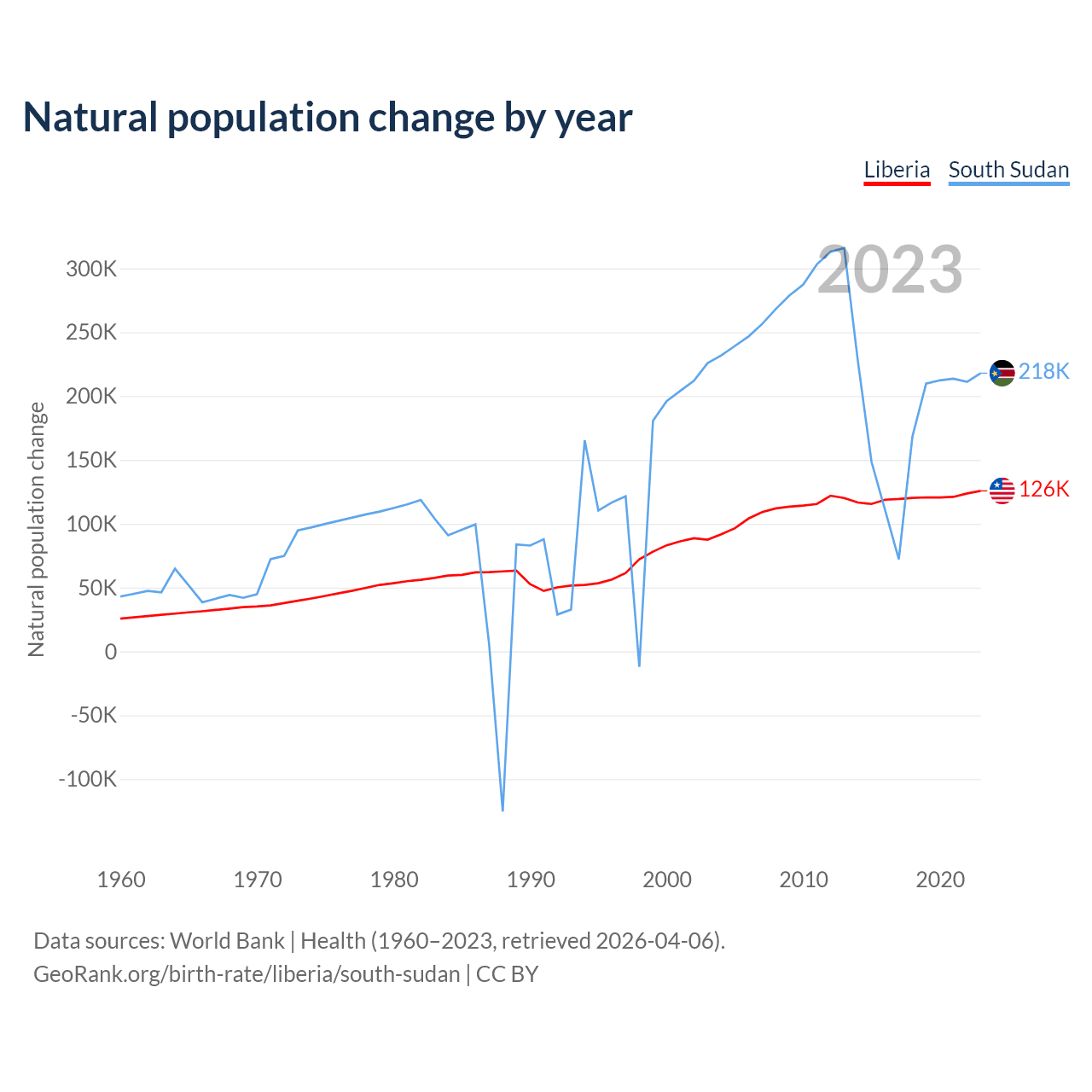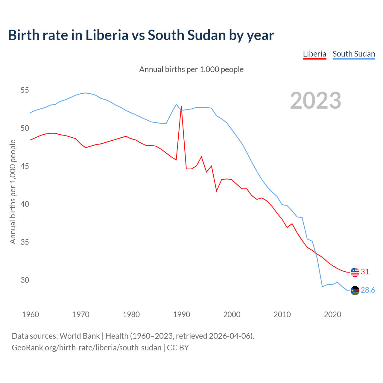 Liberia has an annual birth rate of 31 births per 1,000 people, compared to 28.6 for South Sudan. The average number of children a woman is expected to have during her lifetime — the fertility rate, is 3.95 in Liberia and 3.86 in South Sudan — 2.18% difference.