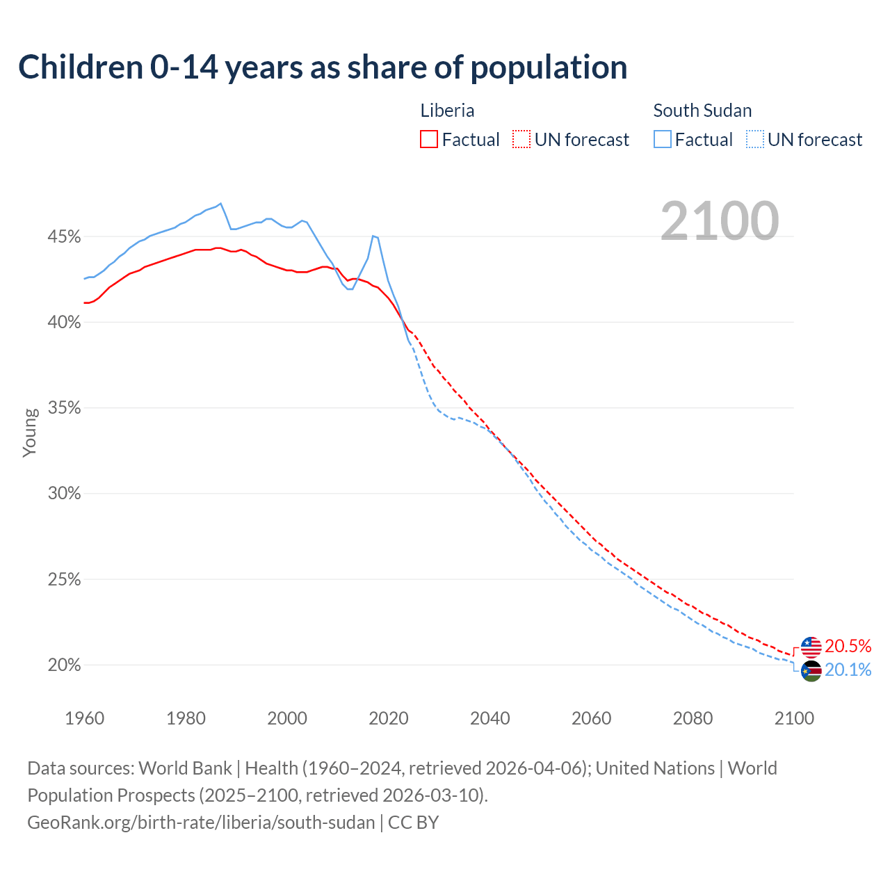 According to the latest available data on birth rates, the fertility rate in Liberia was 3.95 children per woman in 2023, compared to 3.86 in South Sudan in 2023. The replacement level is considered to be 2.1 children per woman.
