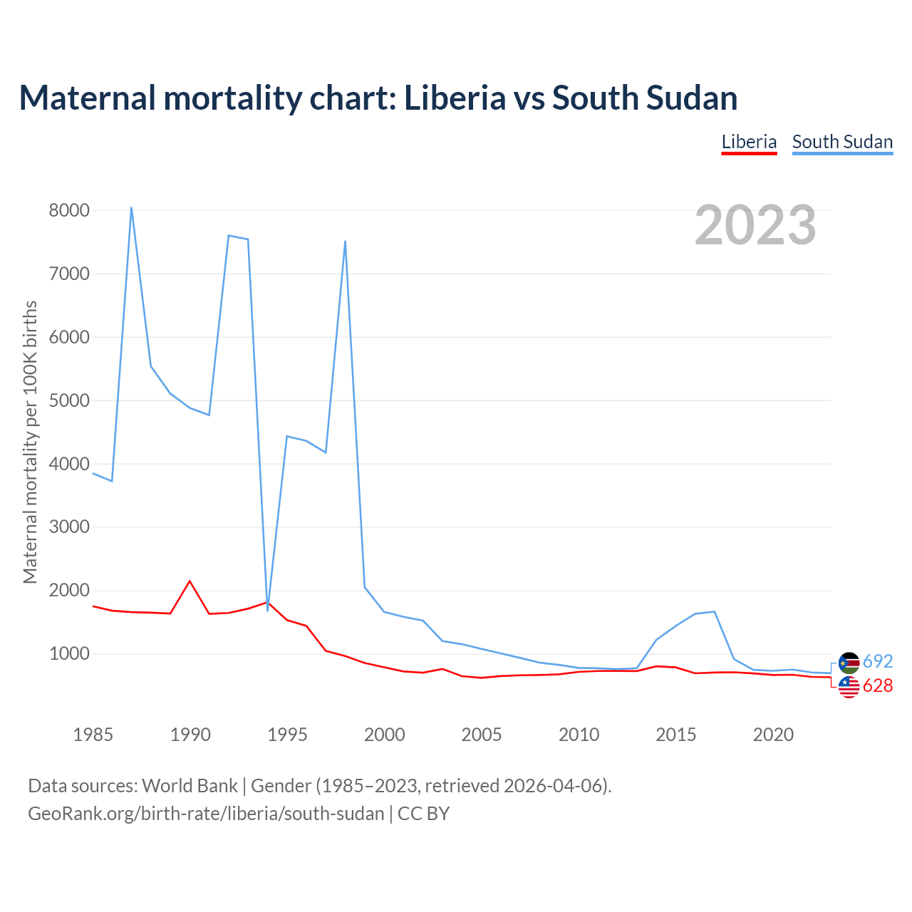 The maternal mortality rate, which is the probability of dying during childbirth or within 42 days of pregnancy termination, is 628 deaths per 100,000 live births in Liberia, compared to 692 deaths in South Sudan.