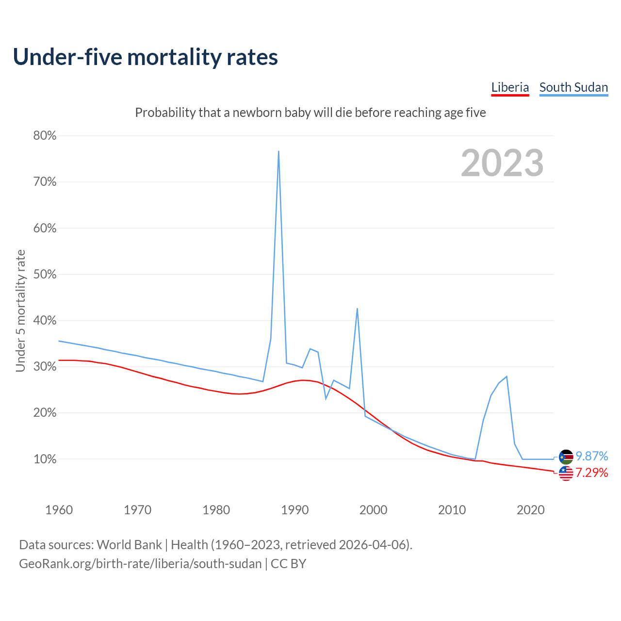 The chance that a newborn baby will die before reaching age five is 7.29% in Liberia and 9.87% in South Sudan. Above is a chart with historical data on under-five mortality rates.