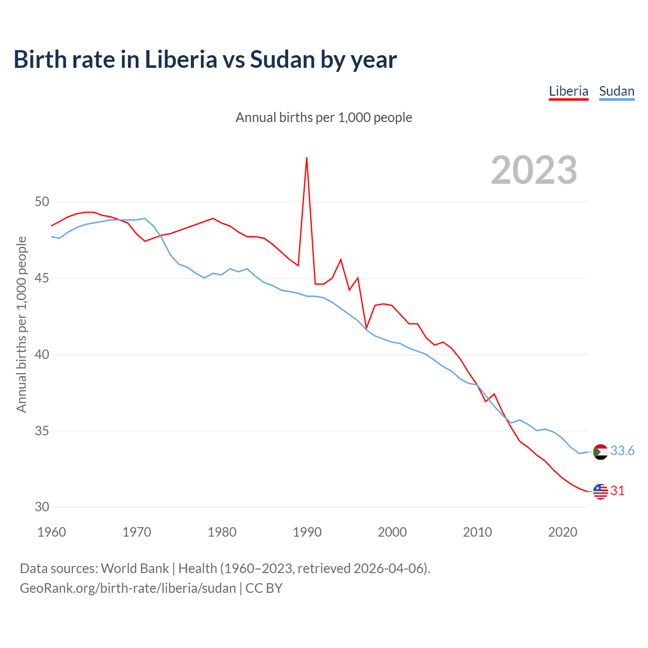 Liberia has an annual birth rate of 31 births per 1,000 people, compared to 33.6 for Sudan. The average number of children a woman is expected to have during her lifetime — the fertility rate, is 3.95 in Liberia and 4.32 in Sudan — 9.44% difference.