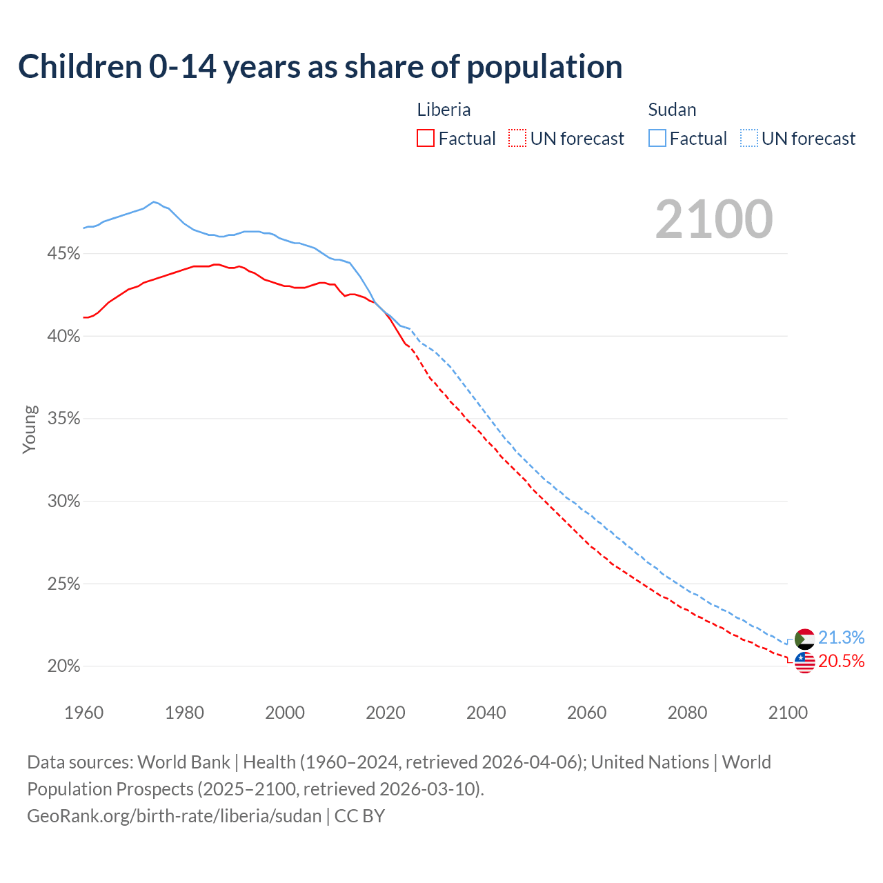 According to the latest available data on birth rates, the fertility rate in Liberia was 3.95 children per woman in 2023, compared to 4.32 in Sudan in 2023. The replacement level is considered to be 2.1 children per woman.