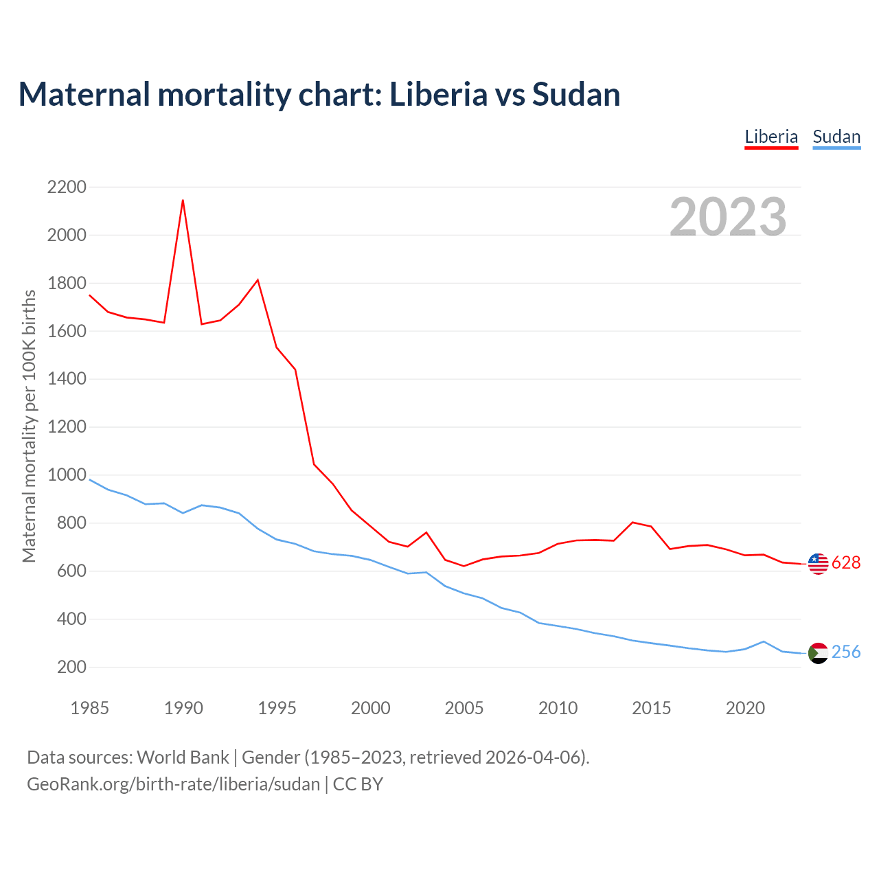 The maternal mortality rate, which is the probability of dying during childbirth or within 42 days of pregnancy termination, is 628 deaths per 100,000 live births in Liberia, compared to 256 deaths in Sudan.