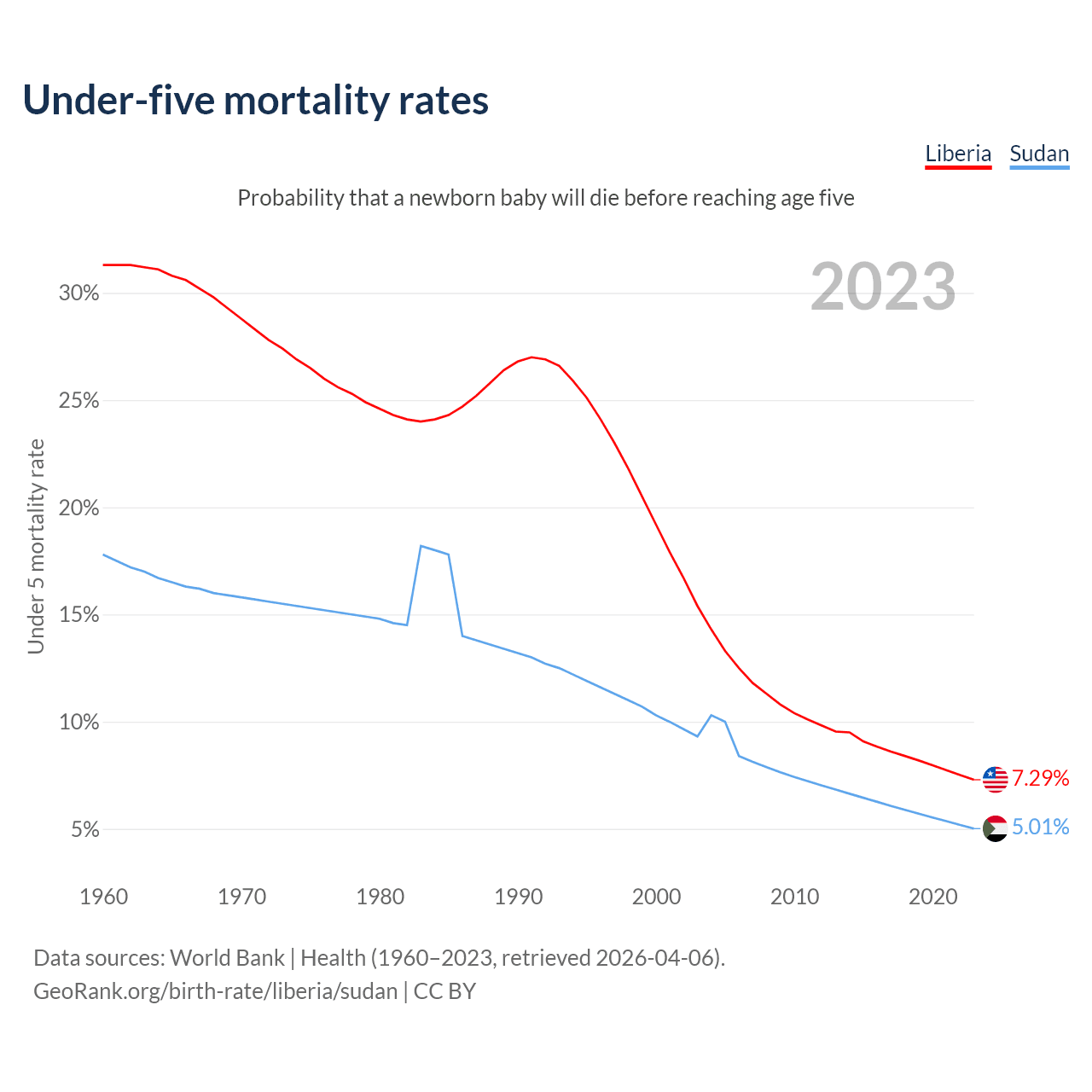 The chance that a newborn baby will die before reaching age five is 7.29% in Liberia and 5.01% in Sudan. Above is a chart with historical data on under-five mortality rates.