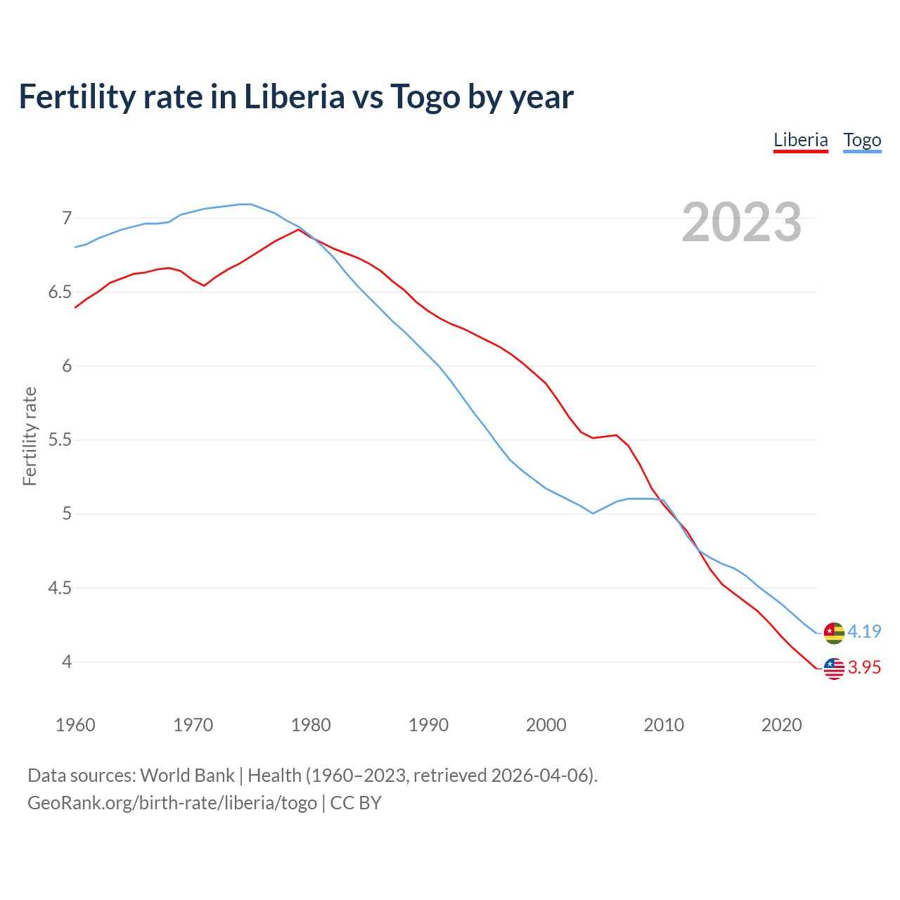 1960 vs 2023, the fertility rate has decreased by 38.2% in Liberia and by 38.3% in Togo — in 1960, it was 6.39 and 6.8, respectively.