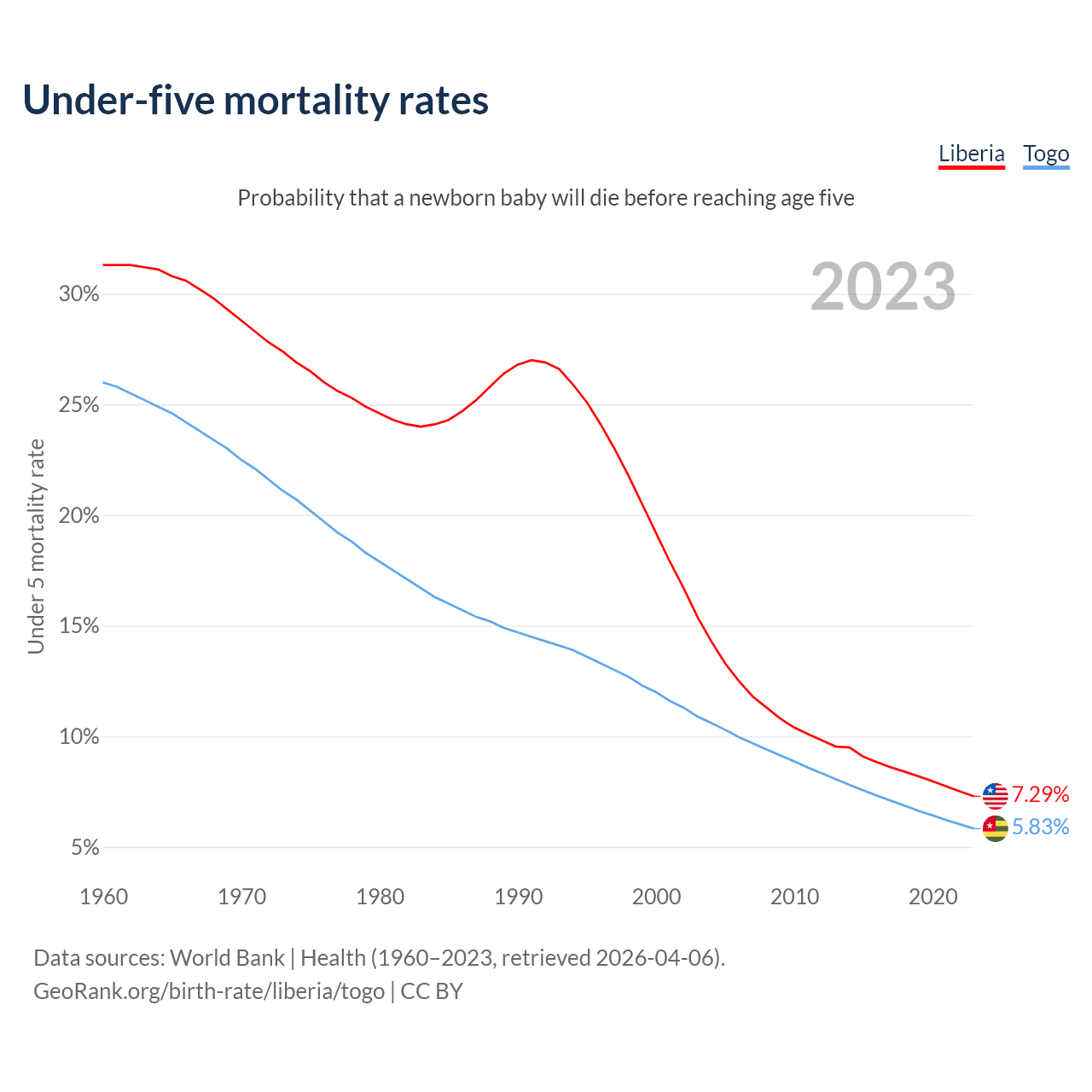 The chance that a newborn baby will die before reaching age five is 7.29% in Liberia and 5.83% in Togo. Above is a chart with historical data on under-five mortality rates.