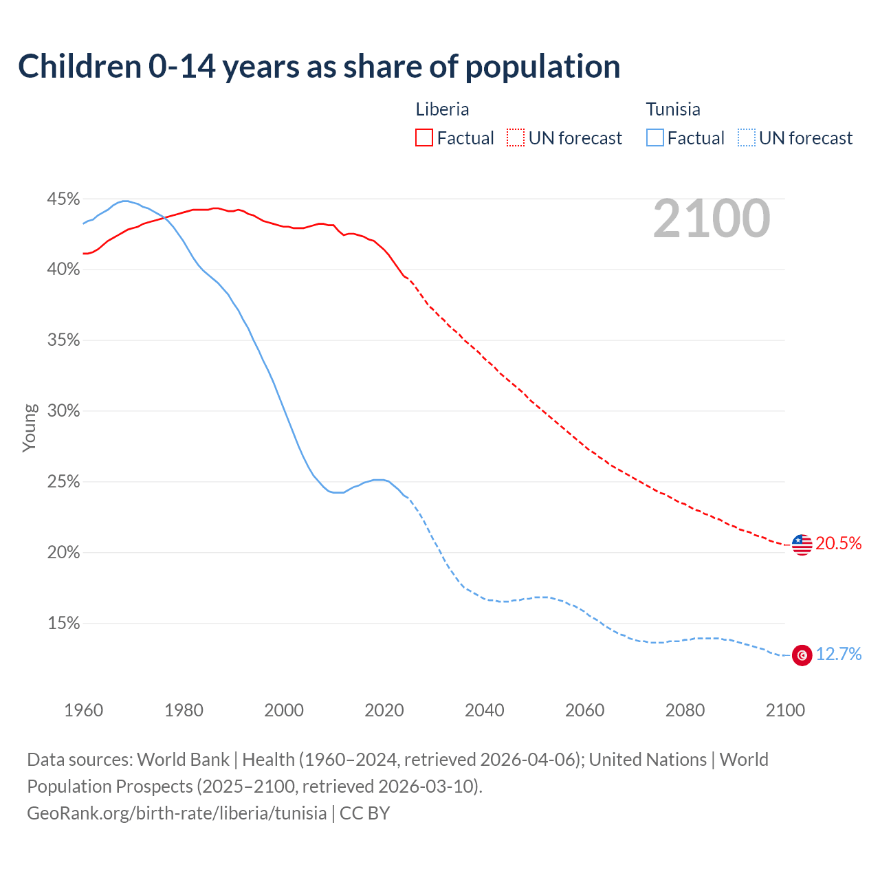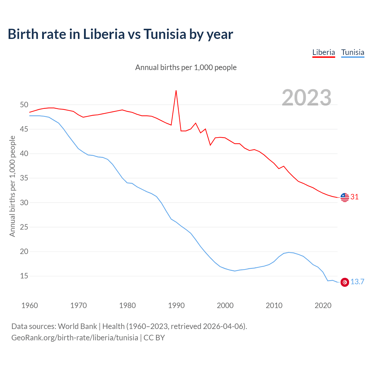 According to the latest available data on birth rates, the fertility rate in Liberia was 3.95 children per woman in 2023, compared to 1.83 in Tunisia in 2023. The replacement level is considered to be 2.1 children per woman.