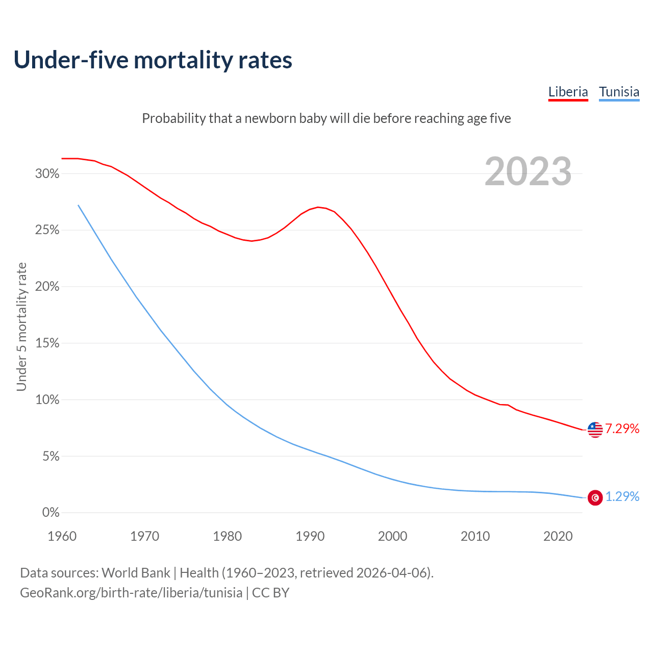 The chance that a newborn baby will die before reaching age five is 7.29% in Liberia and 1.29% in Tunisia. Above is a chart with historical data on under-five mortality rates.
