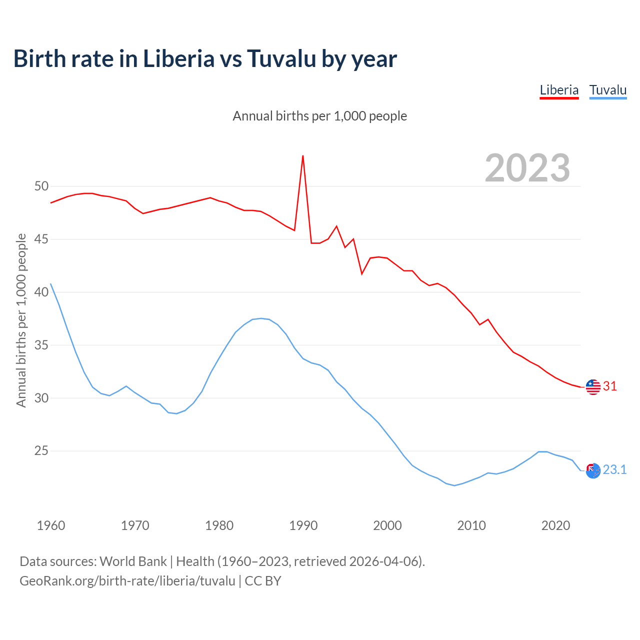 Liberia has an annual birth rate of 31 births per 1,000 people, compared to 23.1 for Tuvalu. The average number of children a woman is expected to have during her lifetime — the fertility rate, is 3.95 in Liberia and 3.21 in Tuvalu — 18.8% difference.