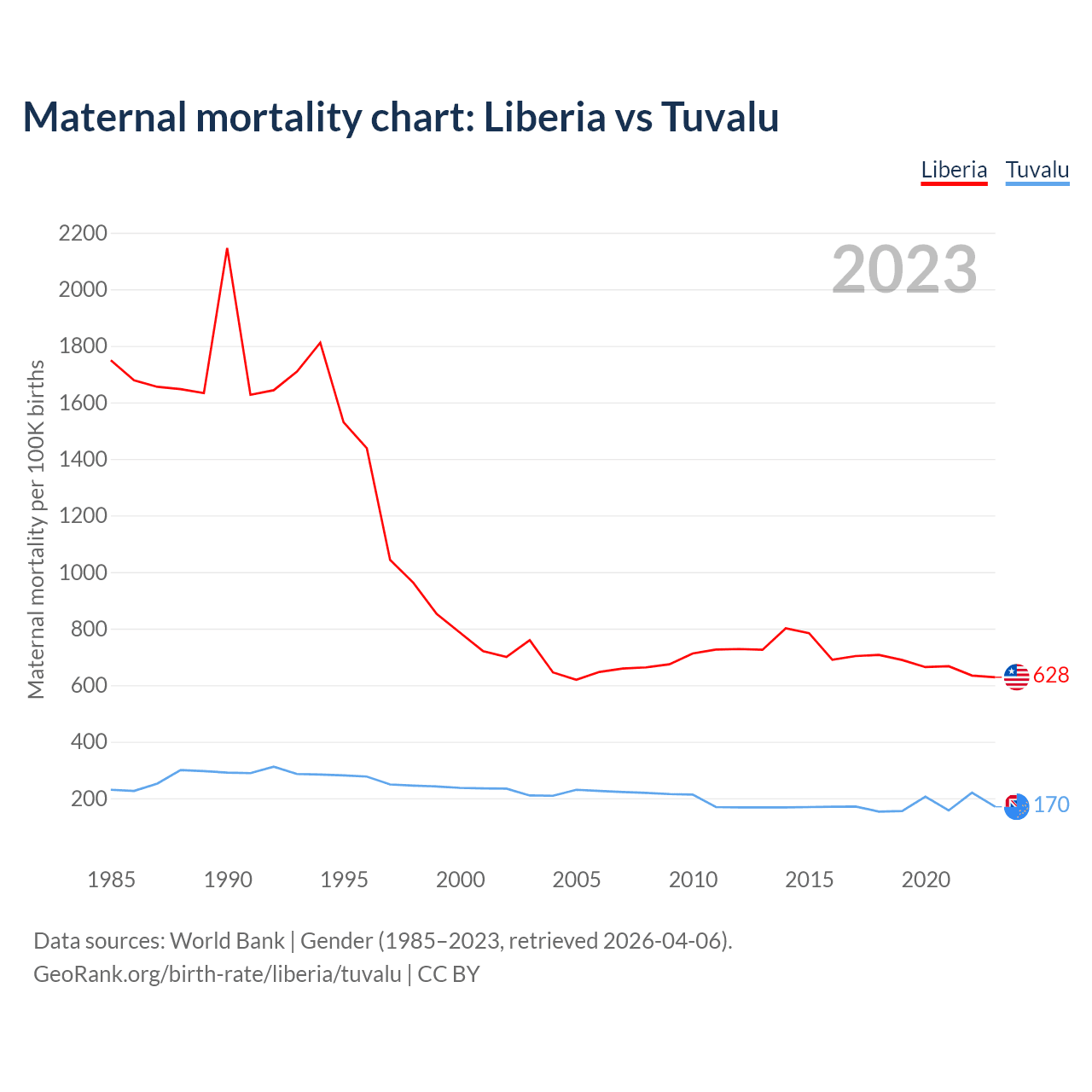 The maternal mortality rate, which is the probability of dying during childbirth or within 42 days of pregnancy termination, is 628 deaths per 100,000 live births in Liberia, compared to 170 deaths in Tuvalu.