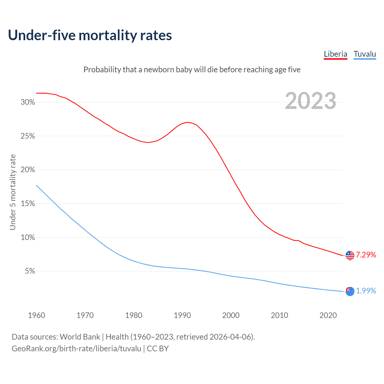 The chance that a newborn baby will die before reaching age five is 7.29% in Liberia and 1.99% in Tuvalu. Above is a chart with historical data on under-five mortality rates.