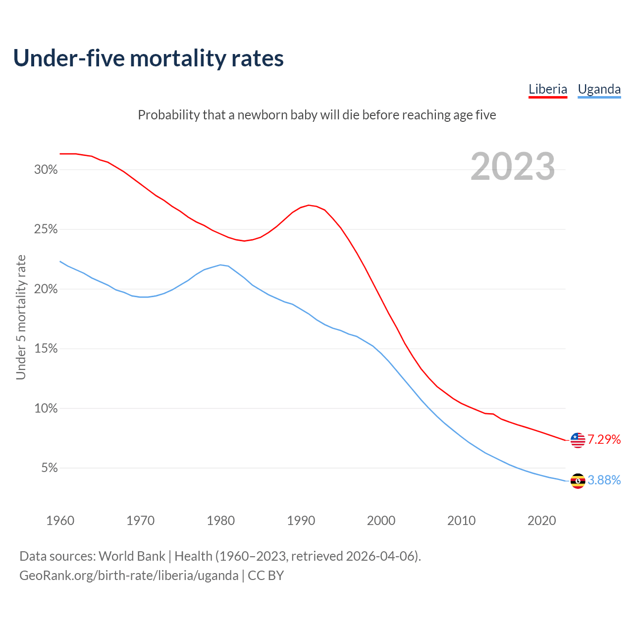 The chance that a newborn baby will die before reaching age five is 7.29% in Liberia and 3.88% in Uganda. Above is a chart with historical data on under-five mortality rates.