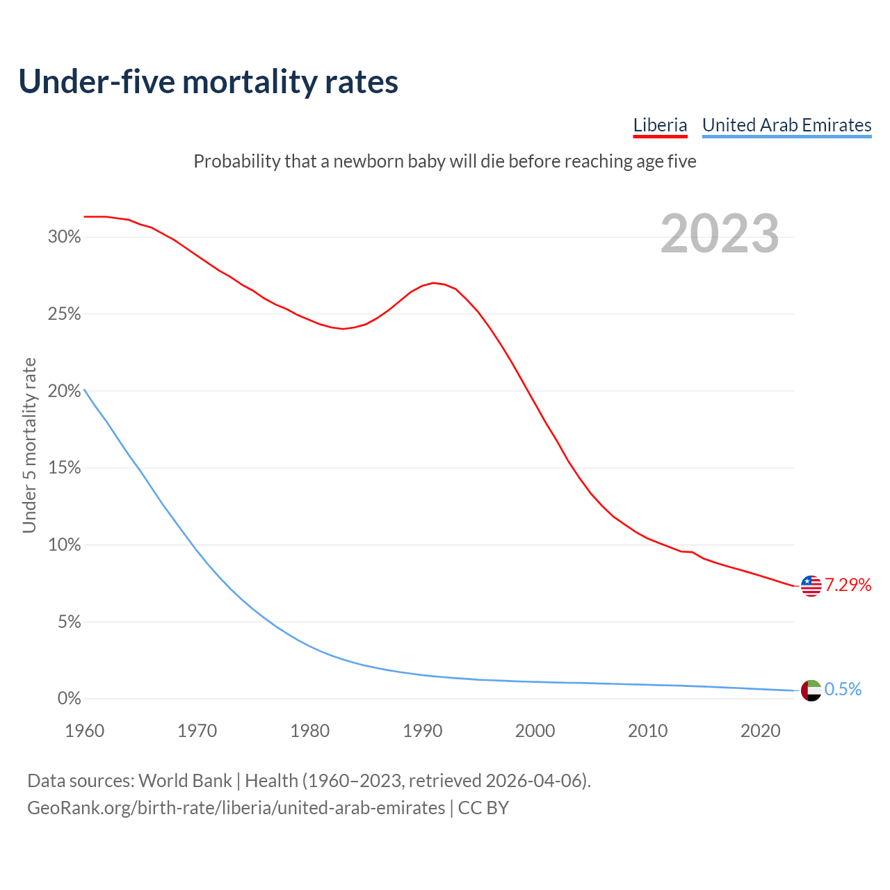 The chance that a newborn baby will die before reaching age five is 7.29% in Liberia and 0.5% in the United Arab Emirates. Above is a chart with historical data on under-five mortality rates.