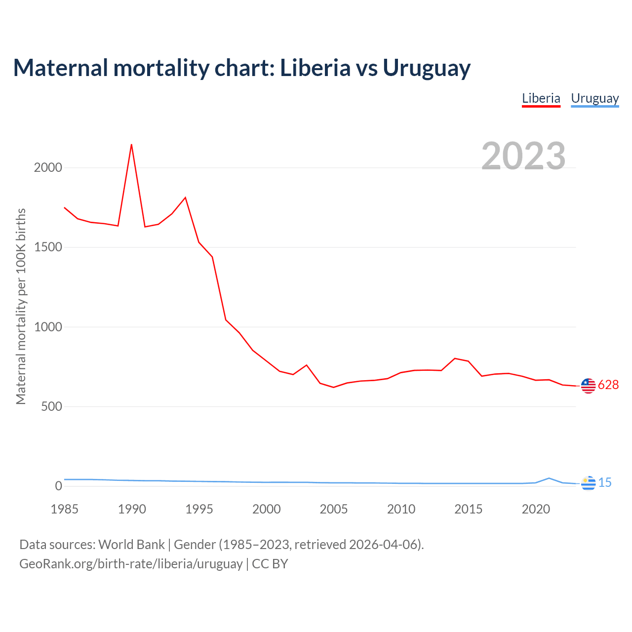 The maternal mortality rate, which is the probability of dying during childbirth or within 42 days of pregnancy termination, is 628 deaths per 100,000 live births in Liberia, compared to 15 deaths in Uruguay.