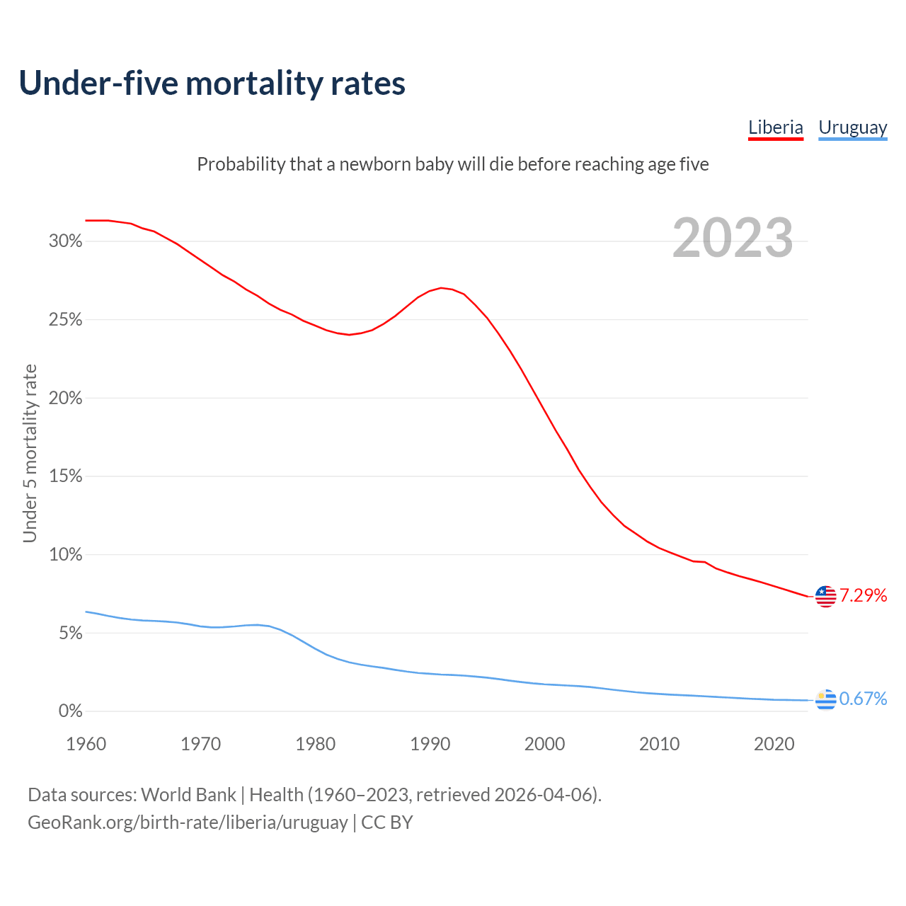 The chance that a newborn baby will die before reaching age five is 7.29% in Liberia and 0.67% in Uruguay. Above is a chart with historical data on under-five mortality rates.