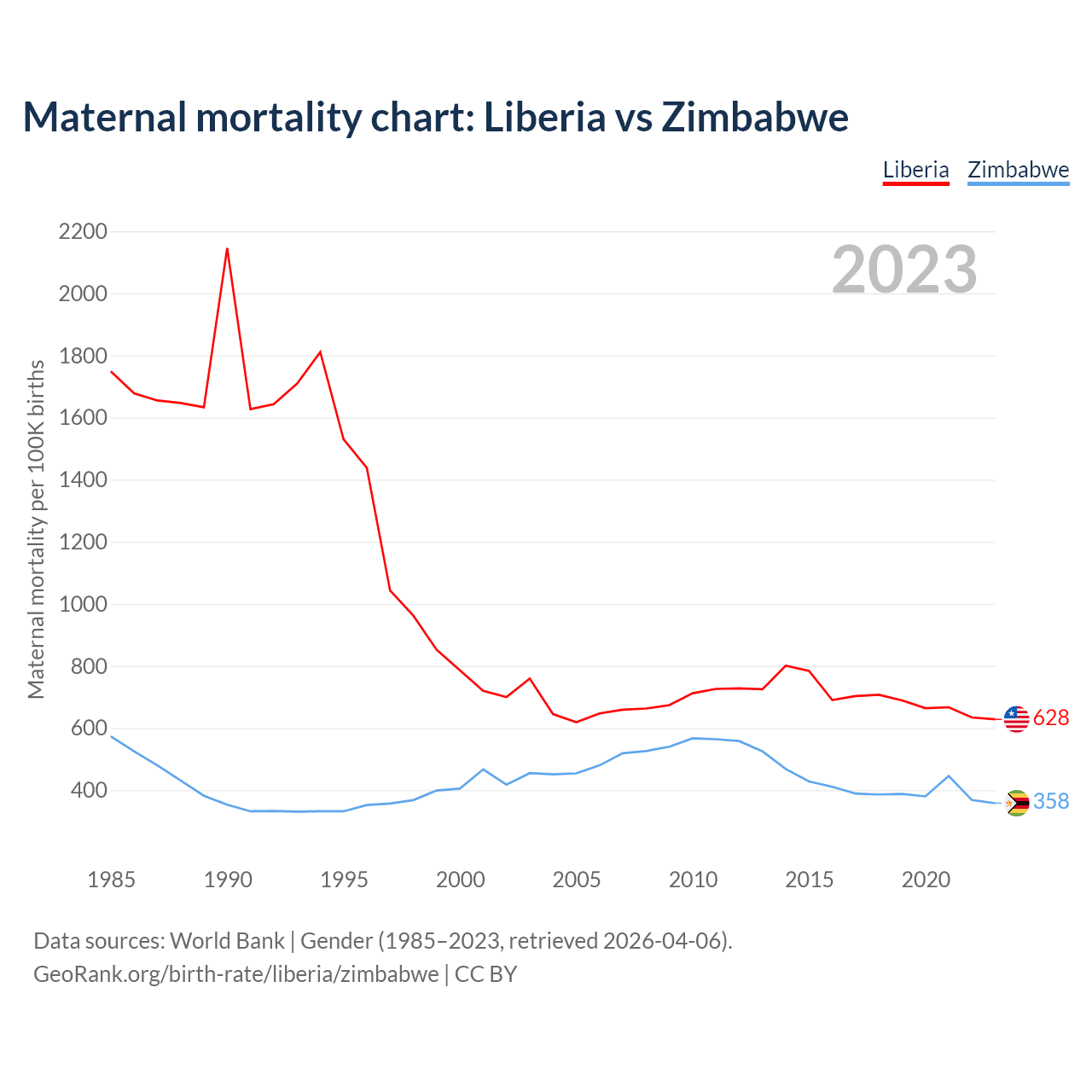 The maternal mortality rate, which is the probability of dying during childbirth or within 42 days of pregnancy termination, is 628 deaths per 100,000 live births in Liberia, compared to 358 deaths in Zimbabwe.