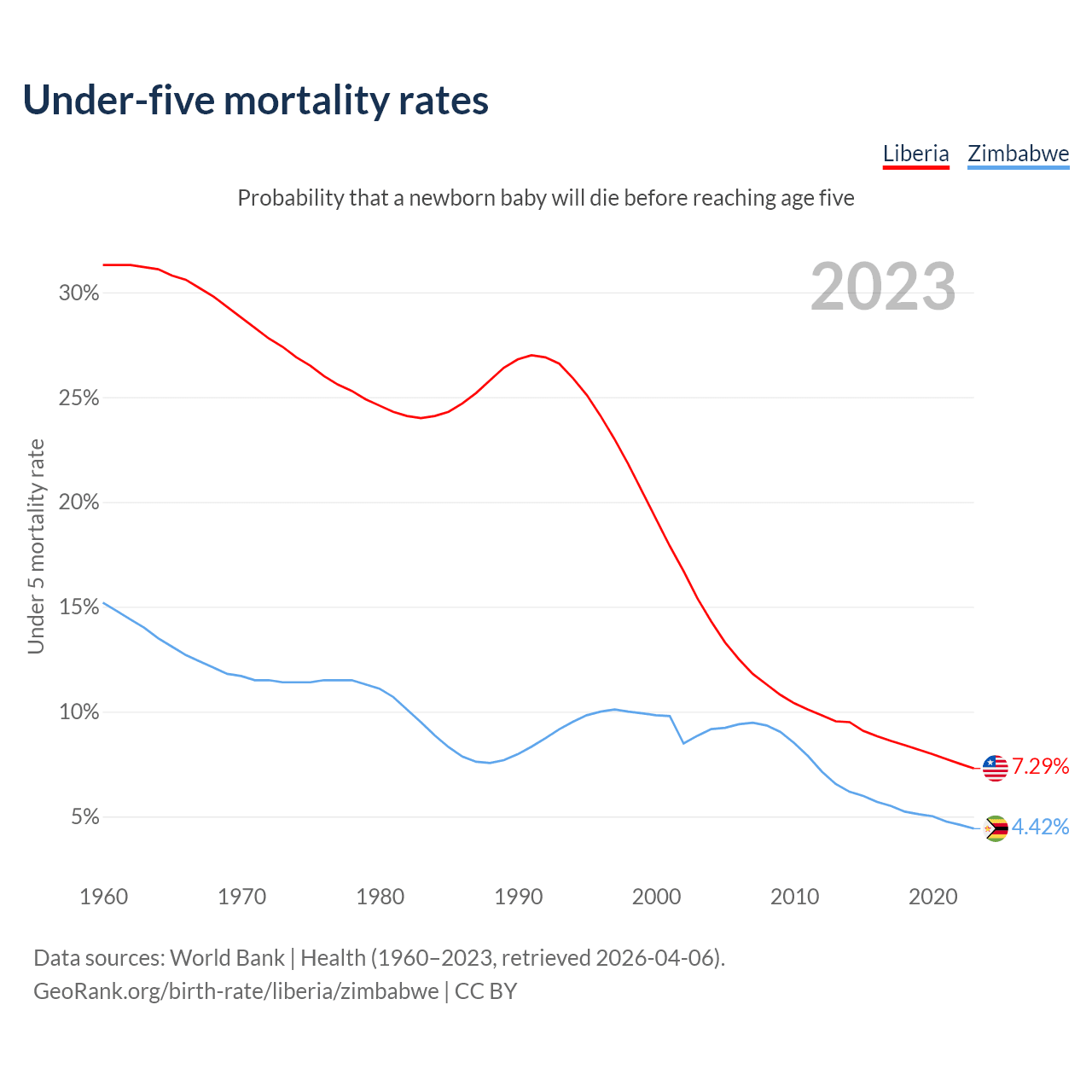 The chance that a newborn baby will die before reaching age five is 7.29% in Liberia and 4.42% in Zimbabwe. Above is a chart with historical data on under-five mortality rates.