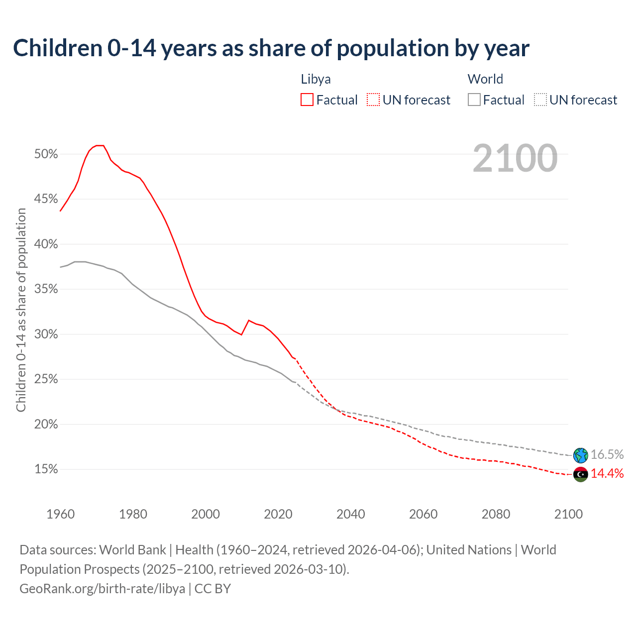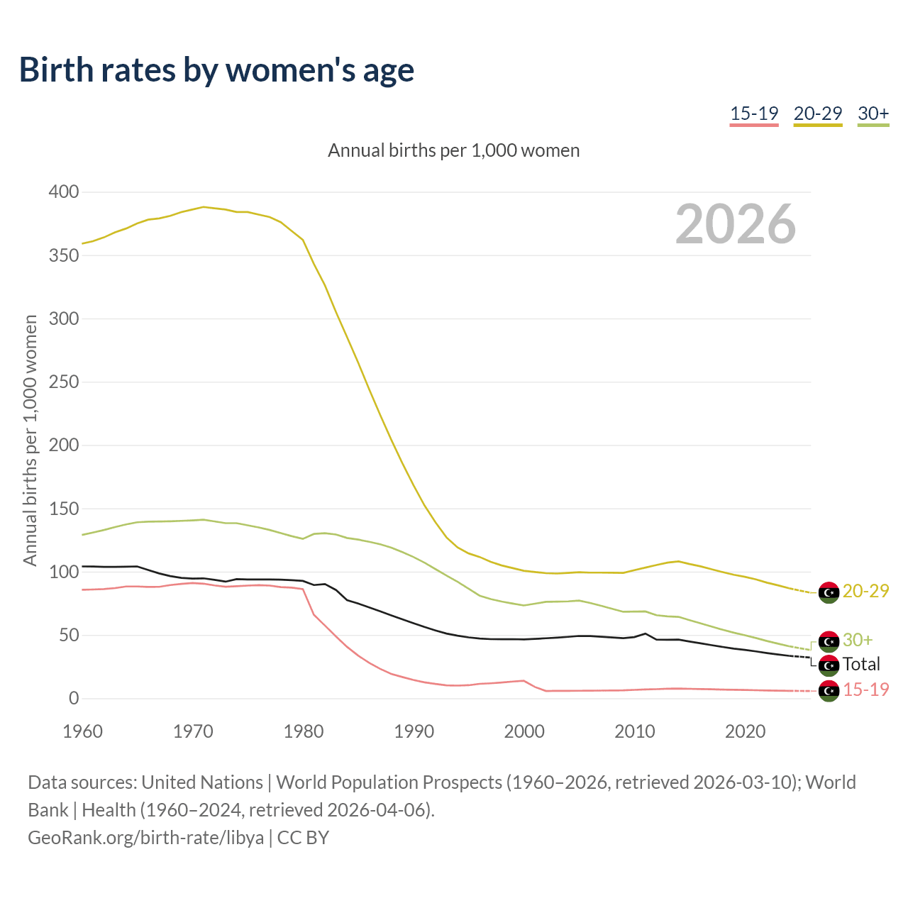 Libya has a birth rate of 17 (annual births per 1,000 people) and a fertility rate of 2.36 (the average number of children a woman is expected to have over her lifetime based on current age-specific birth rates).